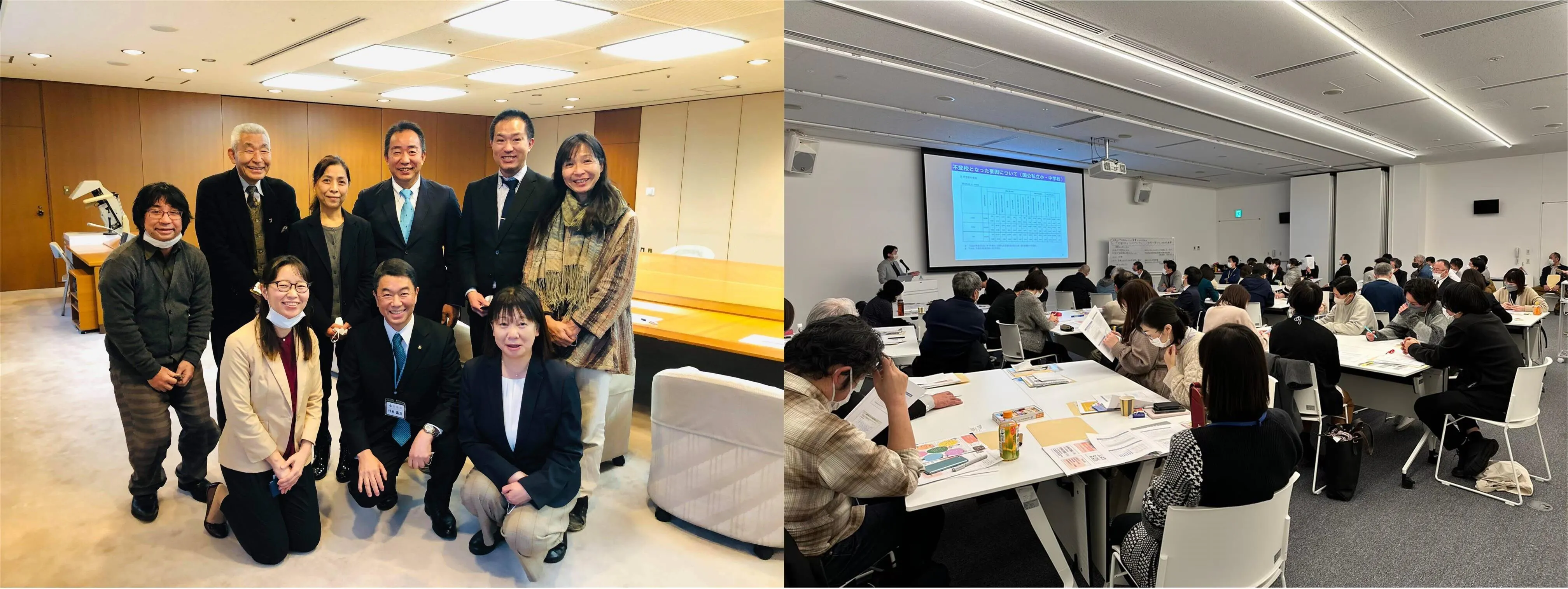 写真左:2020年宮城県内のネットワークメンバーと村井知事に要望書提出。写真右:2022年石巻市内のネットワークでシンポジウム開催