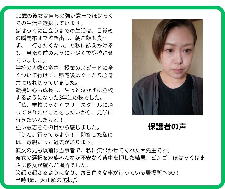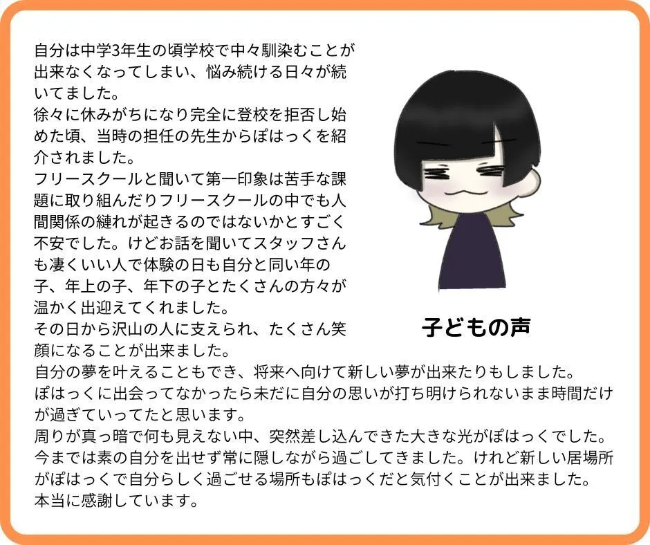 そう思えるまでの年月は子どもによって違いますが、ぽはっくの子どもの多くは、自分の意志で復学を決めたり、高校進学や就職に向けて動き出します。