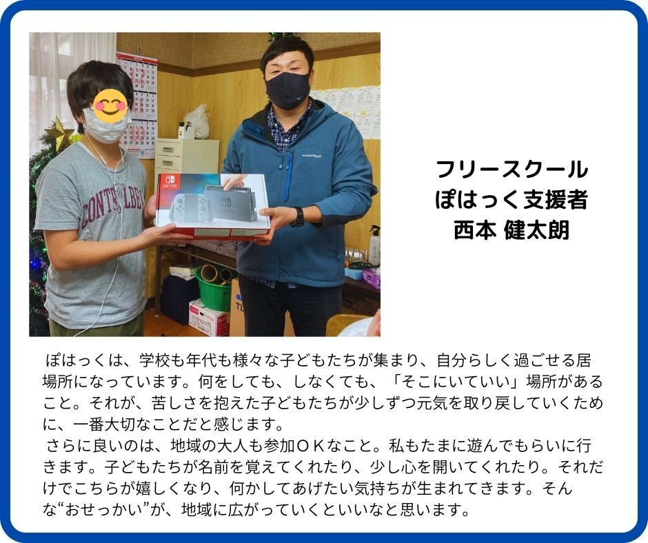 そして2016年秋から『不登校』の子どもの居場所、“フリースクールぽはっく”の活動が始まりました。この活動を支えてくれたのも“空飛ぶくじら号”でした。