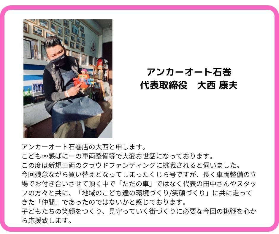 2024/01/25 19:50こんにちは!こども∞感ぱにーのロッキーです以前、くじら号のお披露目会についてご報告の投稿をしました。その時点ではくじら号の象徴たる“くじら”の絵が描かれておらず、また、お披露目会開催中に雨が降ったためペンキが流れ、おどろおどろしい状態でした。あれから時間が経ってしまいましたが、おどろおどろしかったペンキを整え、くじらのペイントをフリースクールの子どもたちが行いました。くじら号の左側面と右側面には、違う種類のくじらのイラストが描かれています。一つはフリースクールの子どもがデザインしたもの。もう一つは今までのくじら号のイラストを元にしたもの。プロジェクターでイラストを投影して下描きし、想いを込めて丁寧に着色しました。作業は思いの外時間がかかりましたが、子どもたちは5時間以上集中して取り組んでいました!作業をした次の日には、早速お出かけ!今まではくじらのシルエットしかありませんでしたが、ようやく魂が吹き込まれ、元気に石巻の道路を泳いでいます。みなさまからのご支援で、本当に素敵なくじら号が生まれました。これから子どもたちは、くじら号に乗ってたくさんの経験や体験の機会に巡り合うでしょう。今後もみなさまの温かい眼差しで、子どもたちの成長を見守っていてください。フリースクール担当 千葉拓己(愛称:ロッキー) もっと見る2代目空飛ぶくじら号購入費用のご報告
