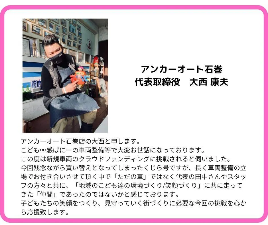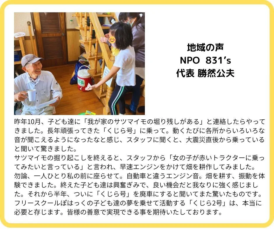 贅沢なお願いかもしれません。でも、少しでも年式の新しい車を購入し、長い期間フリースクールの活動車として子どもの社会的自立へのサポートをしたいと願っています。