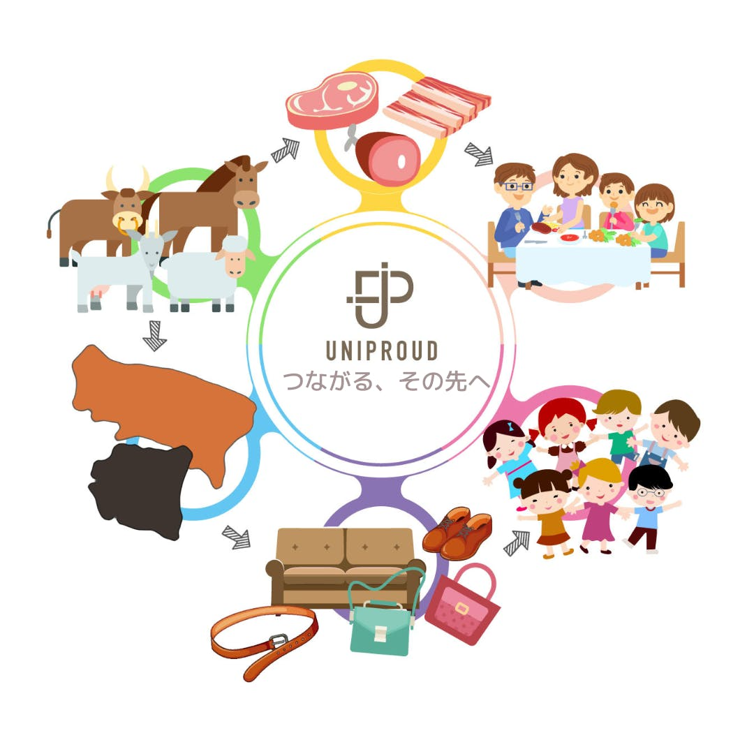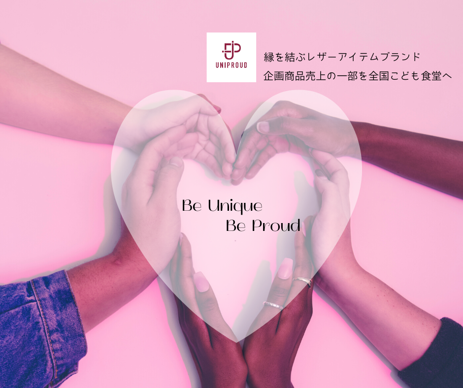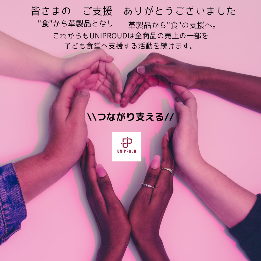 また、食肉の副産物を革製品として『再生』して終わりではなく、未来の子どもたちの『食』『命を支える』持続可能な貢献・支援・還元することを目的に、UNIPROUD企画商品の売上の一部を全国こども食堂に寄付する活動を行うブランドとしても発足しました。