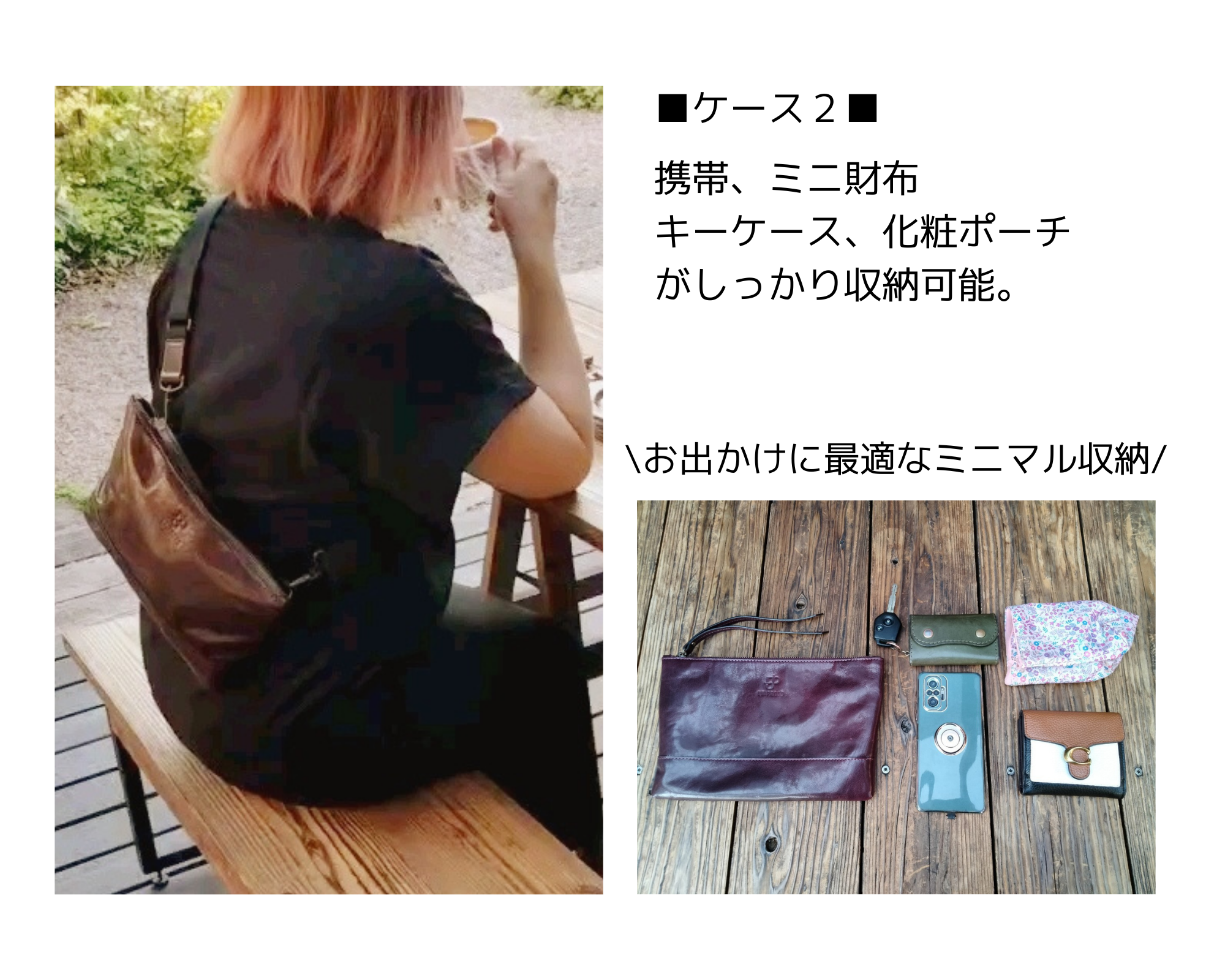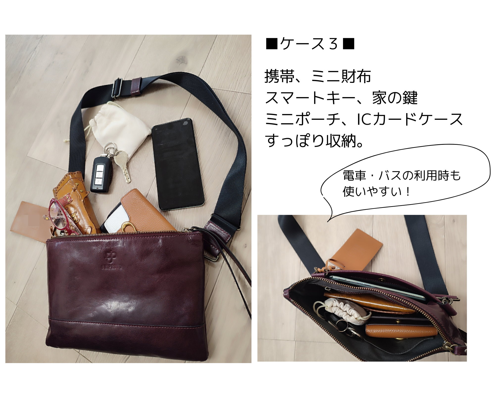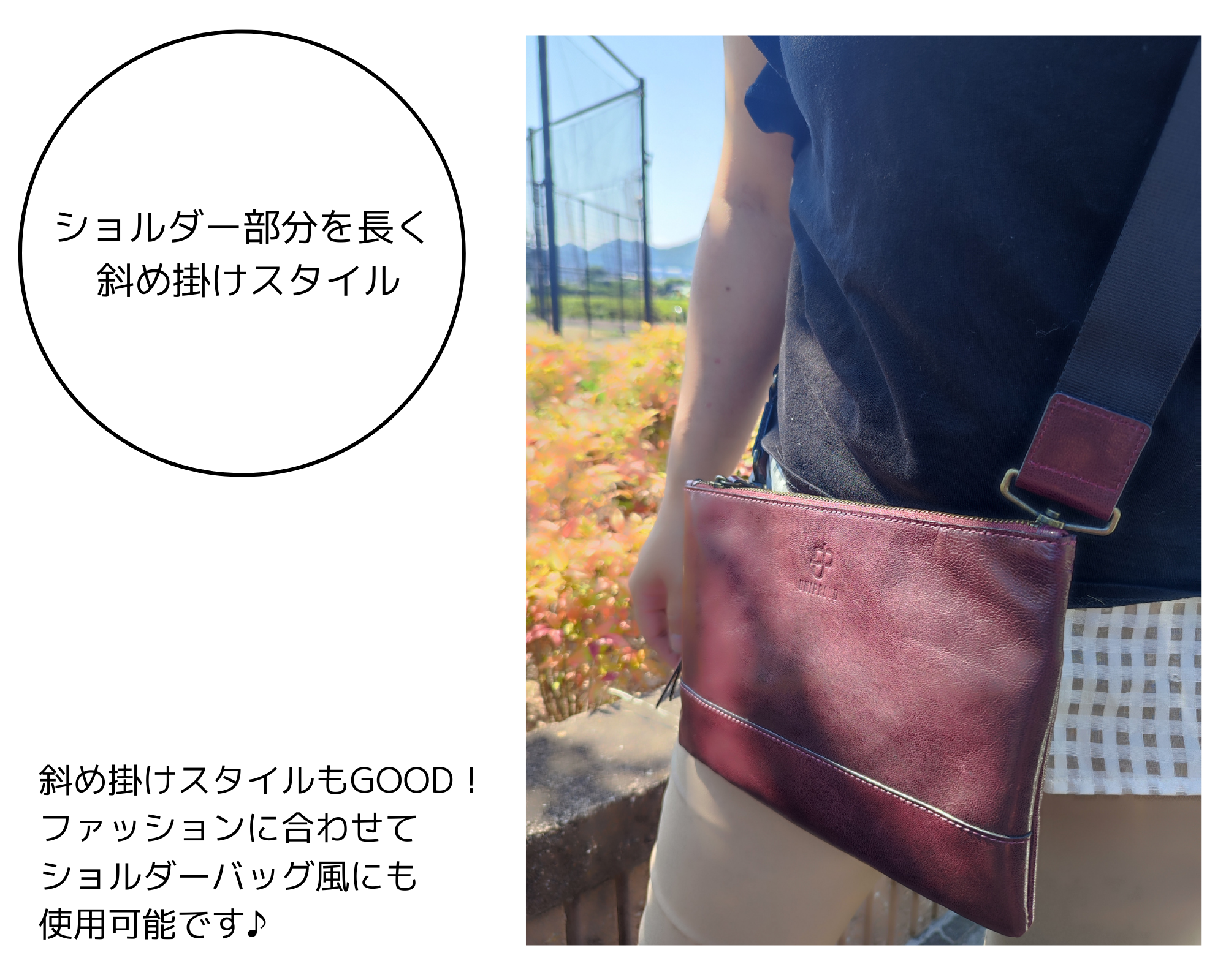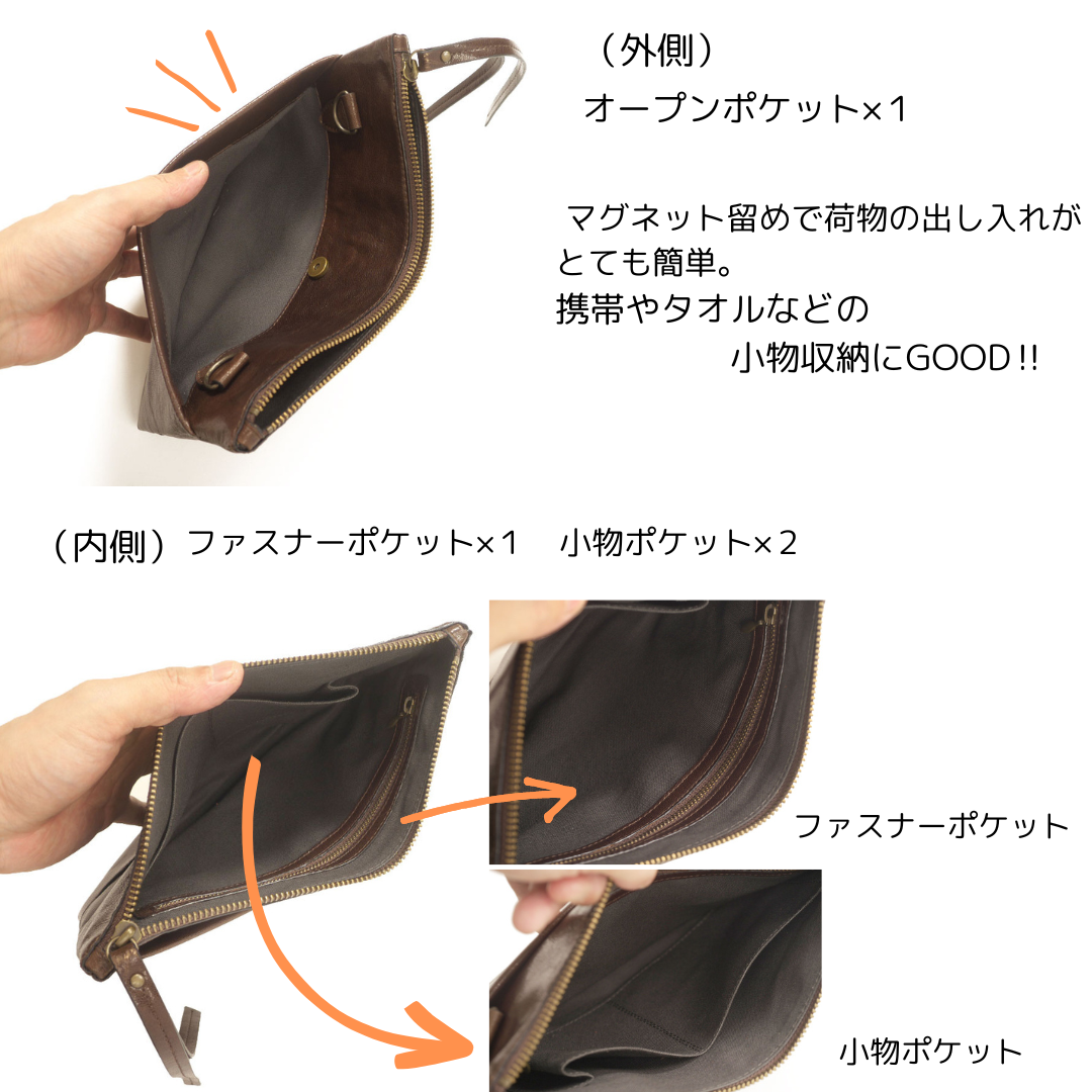 『革』を活かしたシンプルデザインなので男女問わず合わせられるオシャレな本革コサッシュ。ちょこっとのお出かけ、お子様との公園お出かけ中などに貴重品を常に身につけて見守りできるので安心!