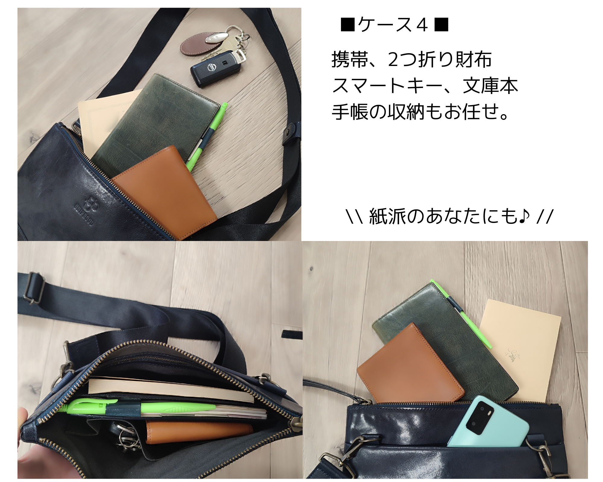 紙派の方でも問題ありません。手帳や文庫本もしっかり入る!男性女性、年齢も問わないシンプルな作りだからこそ、自分にとってのミニマルな収納をお楽しみ下さい♪