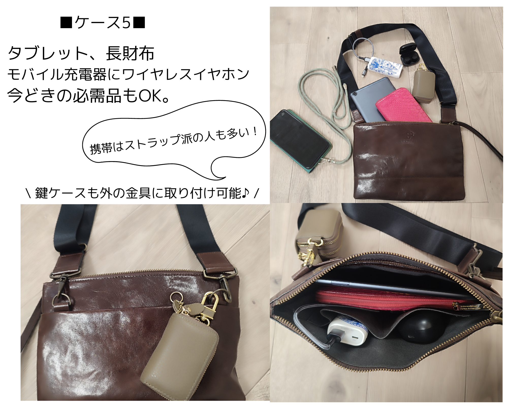 携帯はストラップ派の人も多い時代。タブレットが必需品だとモバイル充電器やワイヤレスイヤホンなども必要最低限の物になりますよね。そんな方でもお使いいただけるサコッシュバッグです。