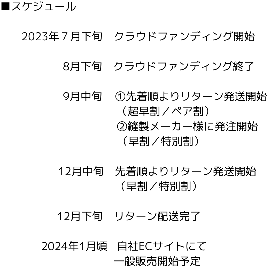 ※超早割/ペア割につきましては、9月中旬より発送予定ですが、早割/特別割につきましてはクラウドファウンディング終了後に縫製メーカー様へ発注を行うため、リターン配送予定を12月中旬から予定しております。