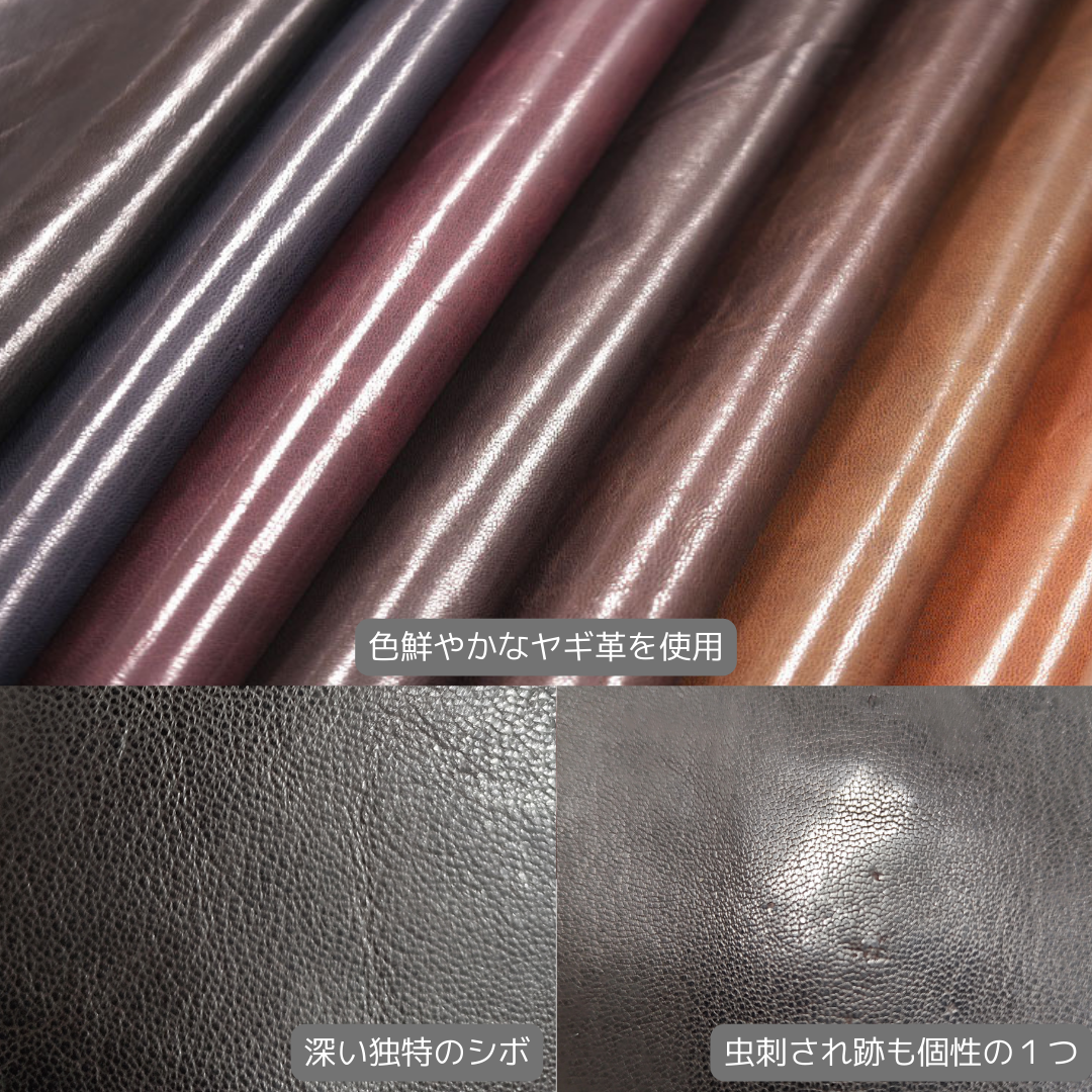 ヤギ革は、革自体が薄くて軽い。それなのに革繊維に弾力性があるので摩擦や型崩れにも耐えられるタフな革でもあります。牛革とは違う独特な表面のシボは、溝が深く細かいためキズが付きにくい&目立ちにくいというメリットも魅力的。だからこそ日常的に使用するバッグには最適です!