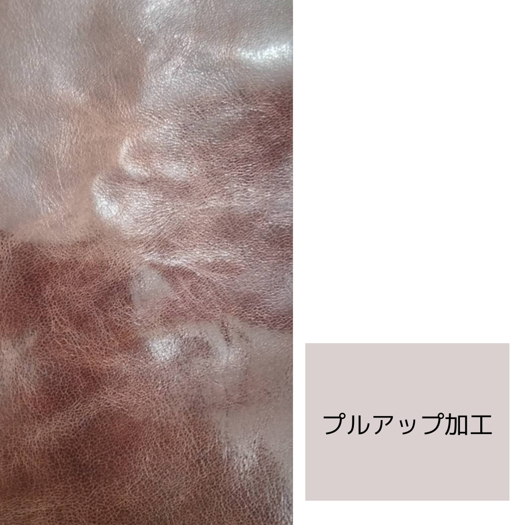 プルアップ加工とは、オイルをしっかり含ませることで、革を曲げたり引っ張ったりした時に内のオイルが繊維内を移動することで革表面の色合い(濃淡)が変わることが特徴。