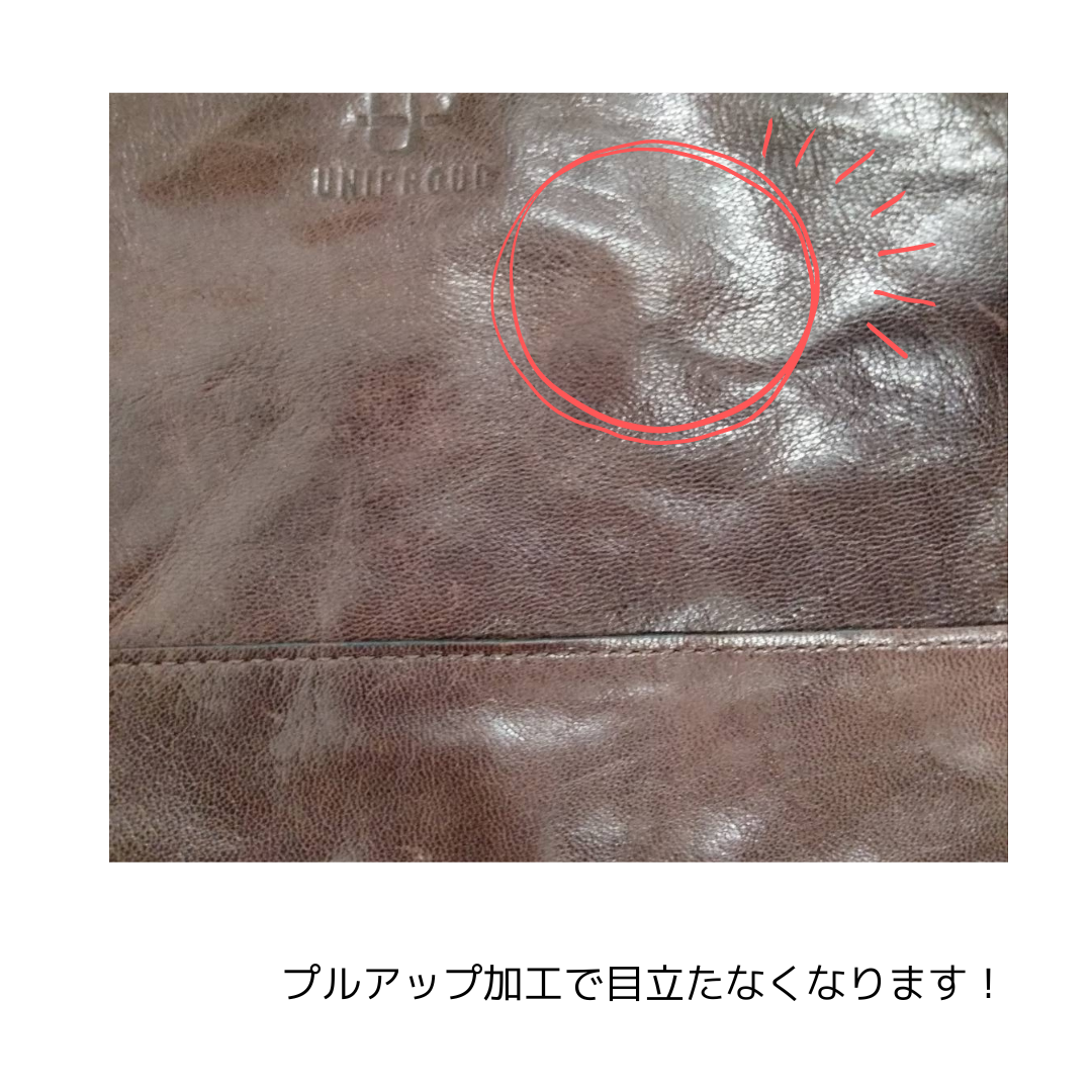 大きな傷や大きな虫刺され跡などはできる限り裁断時に隠れやすい部分に入れる、見えずらい面に採用するなど、縫製メーカー様とできる限りの取り組みを行っていますが、小さな傷や虫刺され跡、その他の小さななど天然跡は個性の一部としてバッグの表面に採用しています。UNIPROUD商品のミッションをご理解の上、これら全てが天然の証であり、唯一無二の『個性』、『魅力』としてご了承ください。