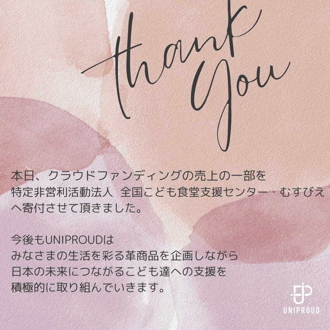 2023/10/11 13:55UNIPROUDのステファニーです。本日、CAMPFAIREの手数料を除いた支援金(売上)の一部を、認定NPO法人 全国こども食堂支援センター・むすびえ への寄付金として振り込みが完了いたしましたのでご連絡させていただきます。 今回ブランド立ち上げてはじめての商品企画、チャレンジをさせていただきました。そのなかで、”食肉の副産物として革製品がある”ということを初めて知ったとのお声もいただき子ども食堂への支援だけでなく、しっかりと”革”についての発信の大事さにも気づいたチャレンジでした。現在、積極的に新商品の企画を行っており、ECサイトも来年春にはオープン予定です。今後も”個性を誇りに!個性を魅力に変えて”をミッションに、生活に溶け込むレザー製品開発、こども食堂への支援を通じて再生の先に子ども達の笑顔につながる社会づくりに貢献していきたいと考えています。あらためまして、皆様のご支援・ご協力によりプロジェクトが成功しましたこと、感謝申し上げます。 もっと見る