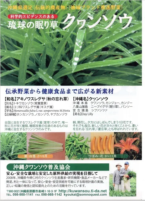 沖縄県内には、未だ知られていない素晴らしい農産物があります。その中でも沖縄伝統野菜28品目のひとつでもある「クワンソウ」和名を「アキノワスレグサ」というユリ科の植物と、新品種の秋ウコン「沖縄皇金(おきなわおうごん)」を原材料とした、現代社会の健康問題に役立つ商品を作りたいとを思いました。
