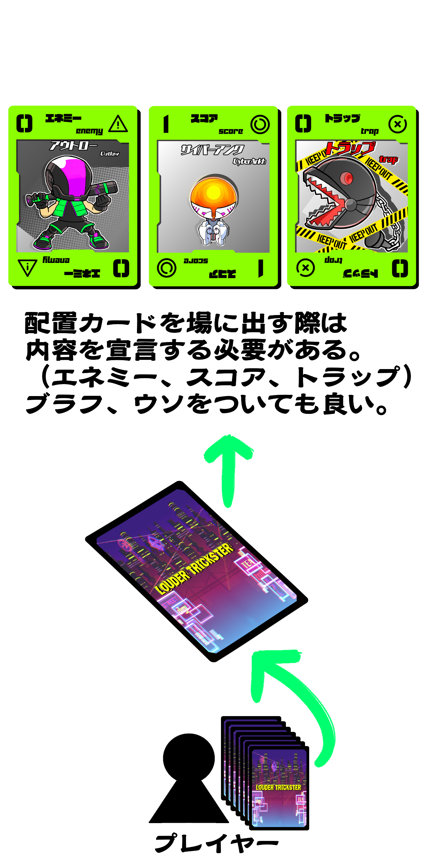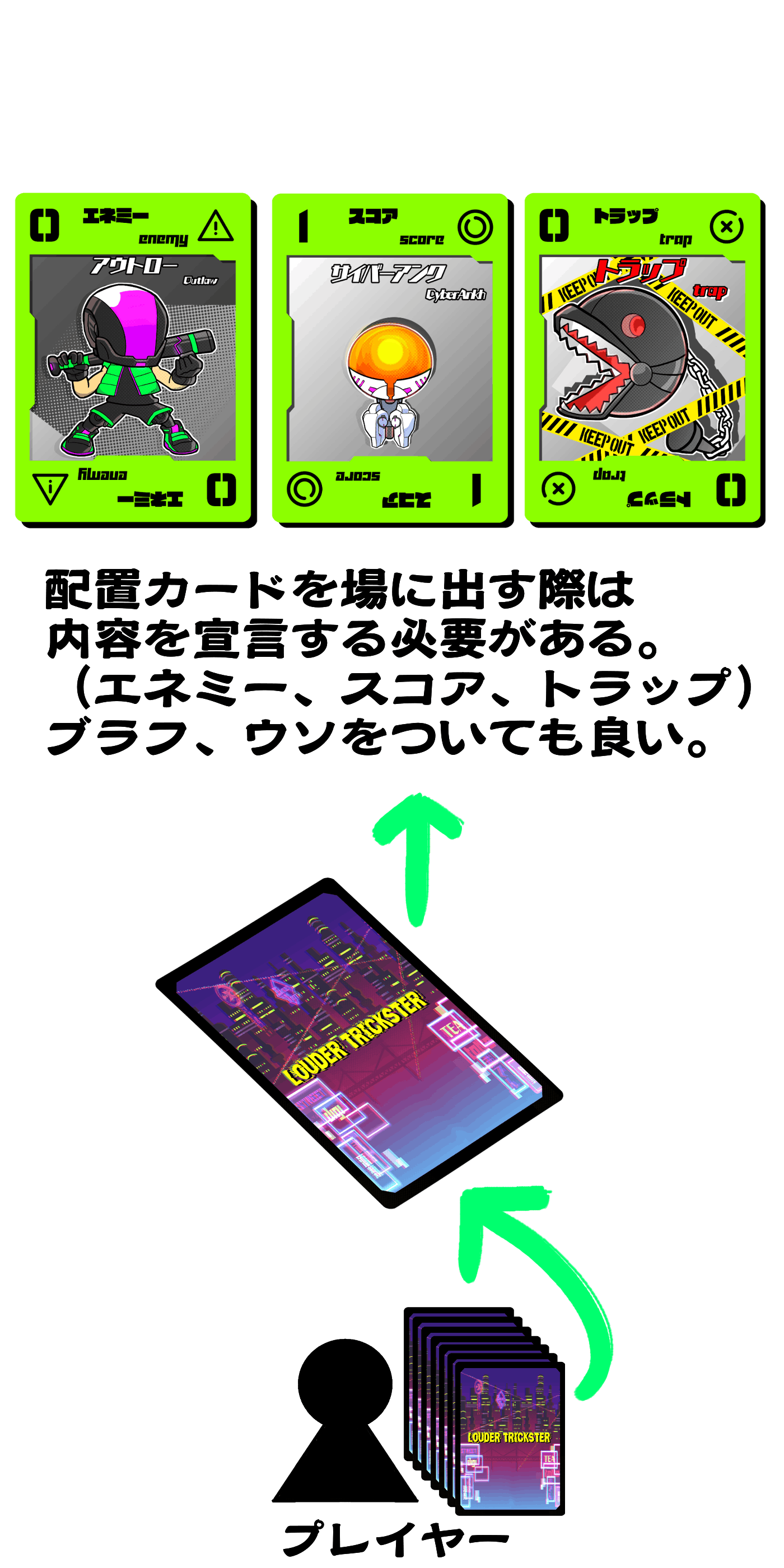 サイバーパンクな世界観をコミカルなイラストで再現したオリジナルアナログカードゲーム『LOUDER TRICKSTER』を購入希望される方々に届けたいです。