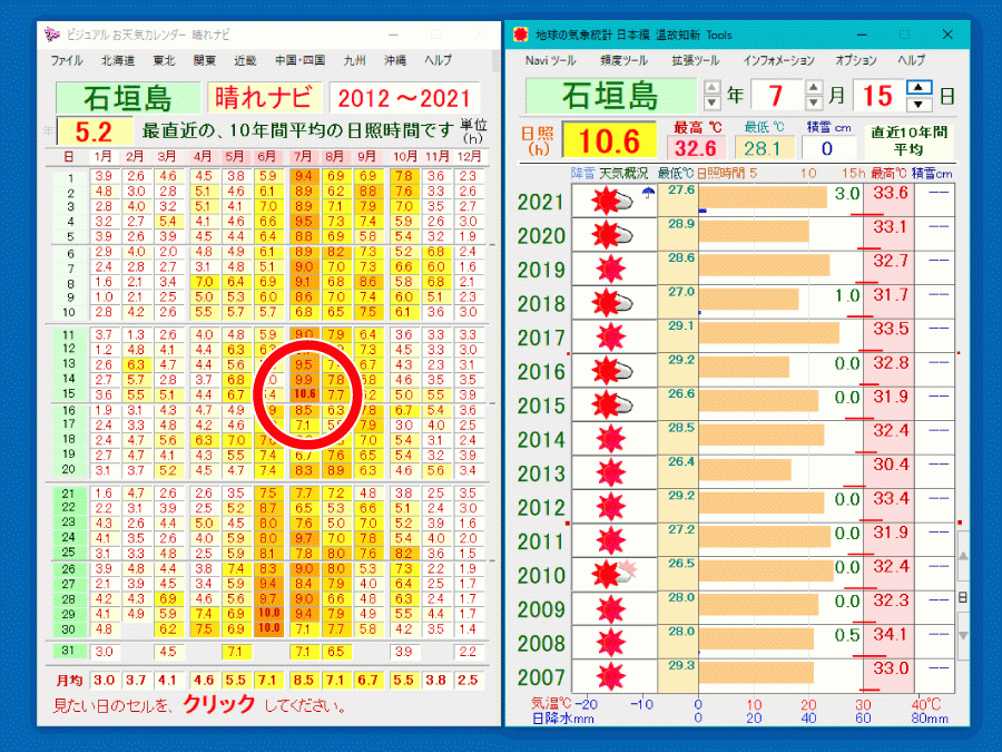 このツールは、気象庁の「天候ダイヤグラム」と同じ原理です。画面の右側をご覧下さい。過去15年間分の天気概況をシンプルに並べて表示しています。しかし、天気概況だけでは、その日がどれくらいの好天だったかを知ることは出来ません。そのため、その日の日照時間をオレンジ色のグラフバーで示しています。この日照時間の多寡により、その日の好天傾向を知ることが出来ます。石垣島の7月15日は、直近10年間の平均日照時間が10.6時間もある素晴らしい好天傾向の日だということがわかります。いかがでしょうか。10年間平均の日照時間の長さが好天の証であることがおわかりいただけたでしょうか。