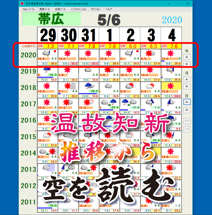 一昔前、「過去の天気は役に立たない!」という先入観が先行した時代があったかも知れません。しかし、現代のようにデジタル社会が当たり前になった今、天候ダイヤグラムのメカニズム原理は「先人の英知」であり、太陽の営みと地球の大気の大循環の営みの天気を、現代のデジタルITの多要素解析によって「好天になりやすい日や時期」を示すことを可能にしています。この素晴らしい「人類の英知」でもある過去天気の知見のツールを、是非活用していただきたいと思います!