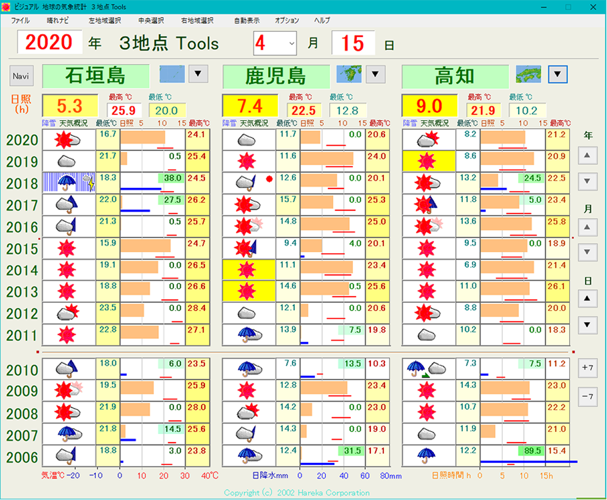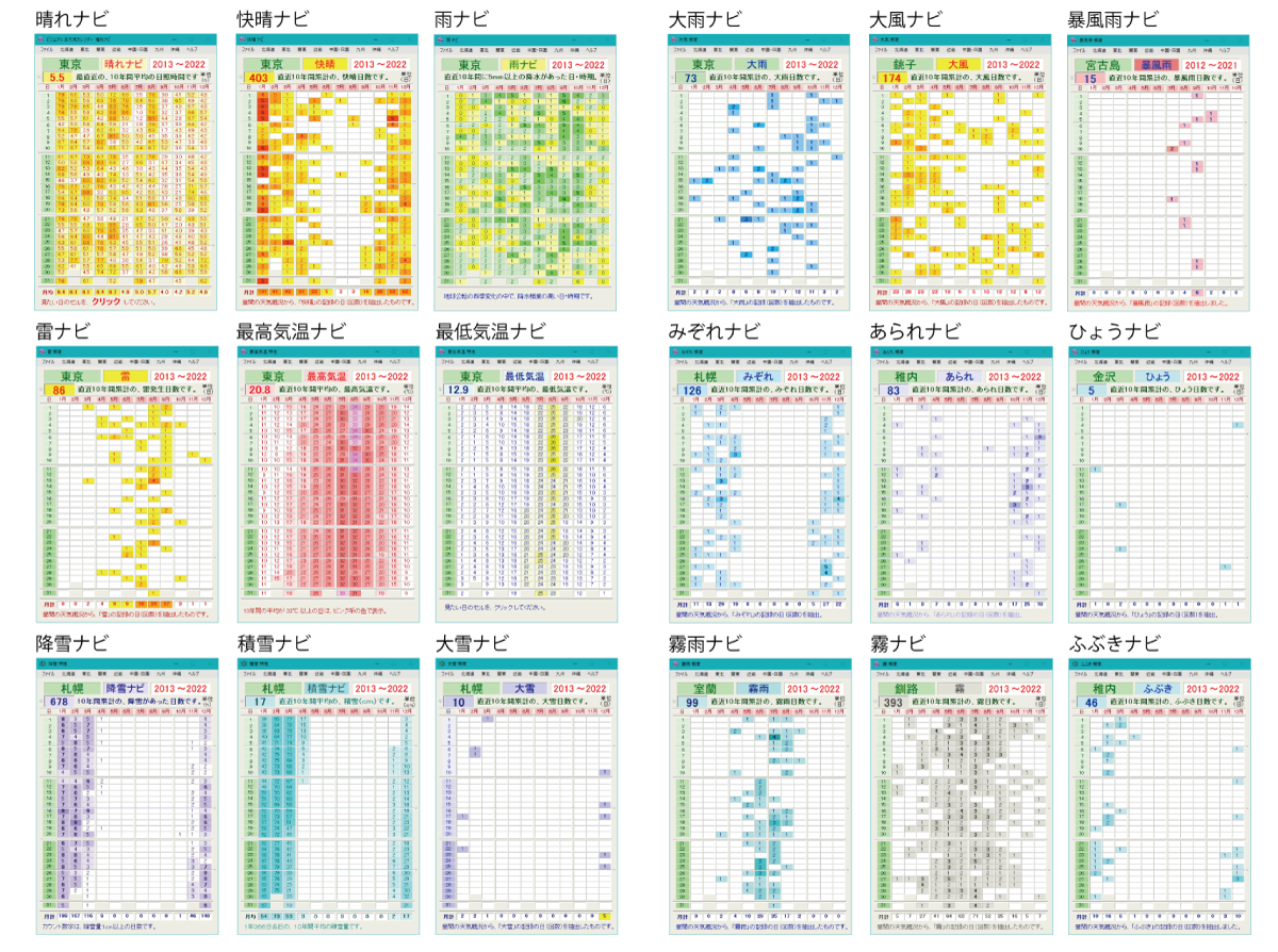 見たい日を選んでクリックするだけ。その日がどんな日かがわかる夢のツールです。「晴れナビ」の発想は、気象庁の「天候ダイヤグラム」をカラー化する発想から産まれています。気象庁には、改めて感謝いたします。「晴れナビ」は、このツールがユーザーにより育てられてきたという経緯の最たる例となっています。