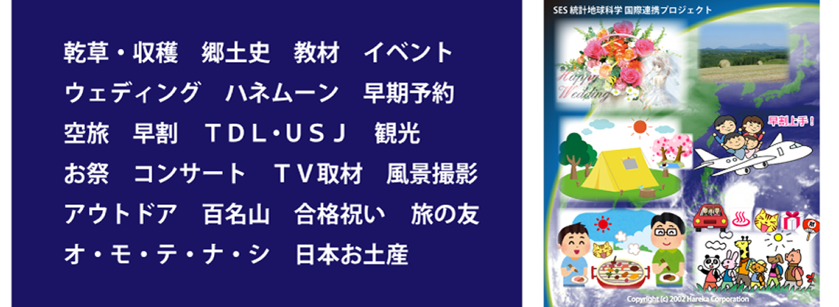 日常生活は無限です。災害を避けることは出来ませんが、軽減することは出来ます。好天メリット大の計画をプランニングすることが出来ます。人出が命の催事イベント、地域の収穫祭、道の駅イベント、花火大会、産業祭り、農林水産・建設土木・お祭り・アウトドア・ 山・旅行・防災関係、すべてに役立ちます。 365日の天気は力です。折り紙付きの知見を味方にしてください!