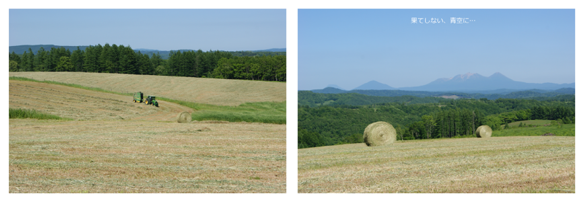 北海道十勝・足寄町 大誉地(およち)の高台から望む雄大な阿寒連山。うっすらと緑色を残して干し上げる最高品質・最高栄養価の乾草を収穫するために、雨に一度も当てない懸命な努力が続けられます。この風土が北海道品質を育てます。 2013年 6月30日 43°25′48″ N 143°39′21″E 農道脇より撮影 左端から、手前稜線の陰奥に頭頂部を微かに見せる阿寒摩周国立公園の雄阿寒岳、その右三角形のフップシ岳、白い頂上の雌阿寒岳、最右に端正な阿寒富士。