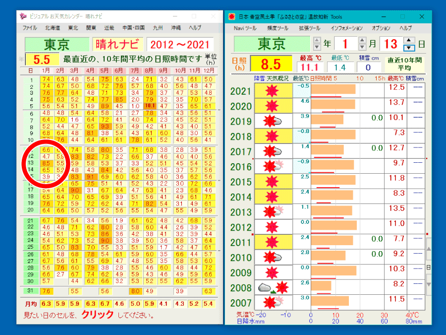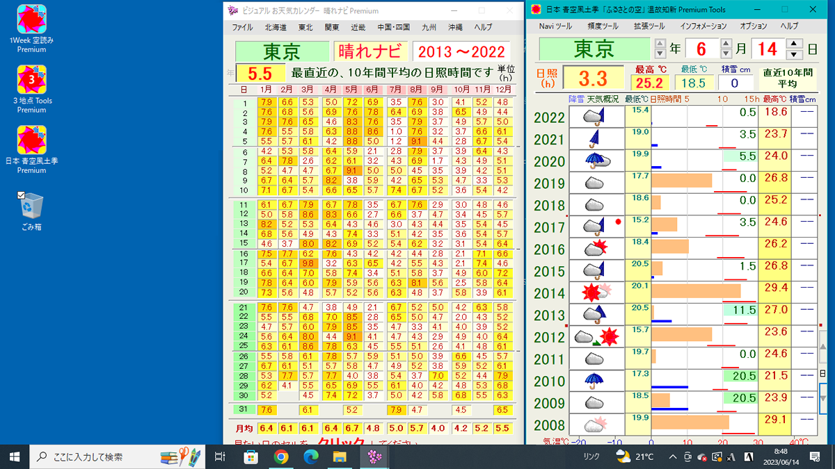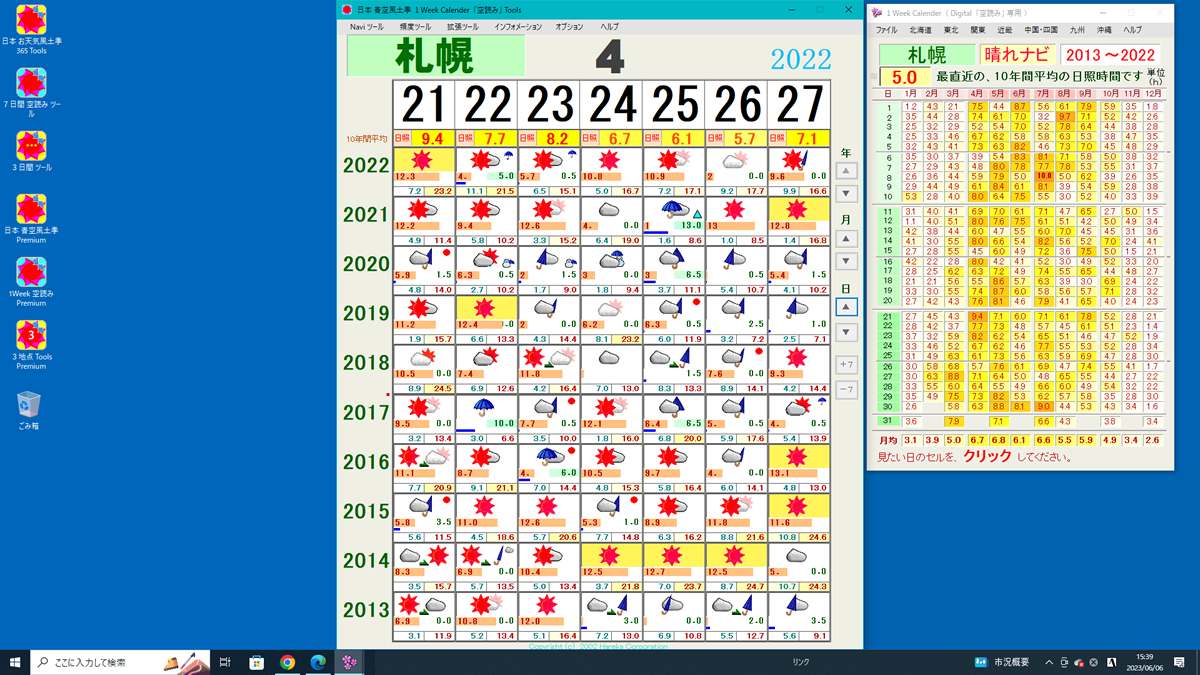 重要ノウハウの4点目です。この画面では、過去15年間分の過去天気を一度に見ていますが、近年は地球温暖化が進行し、地球環境も大きく変化してきています。もはや、10年以上も前の古い時代のデータは参考にはなりません。こういう点を考慮し、最新最直近の10年間のみのデータを指標としています。具体的には、右側画面の最上段、日照(h)の大きな数字は、直近10年間の平均日照時間を表しています。