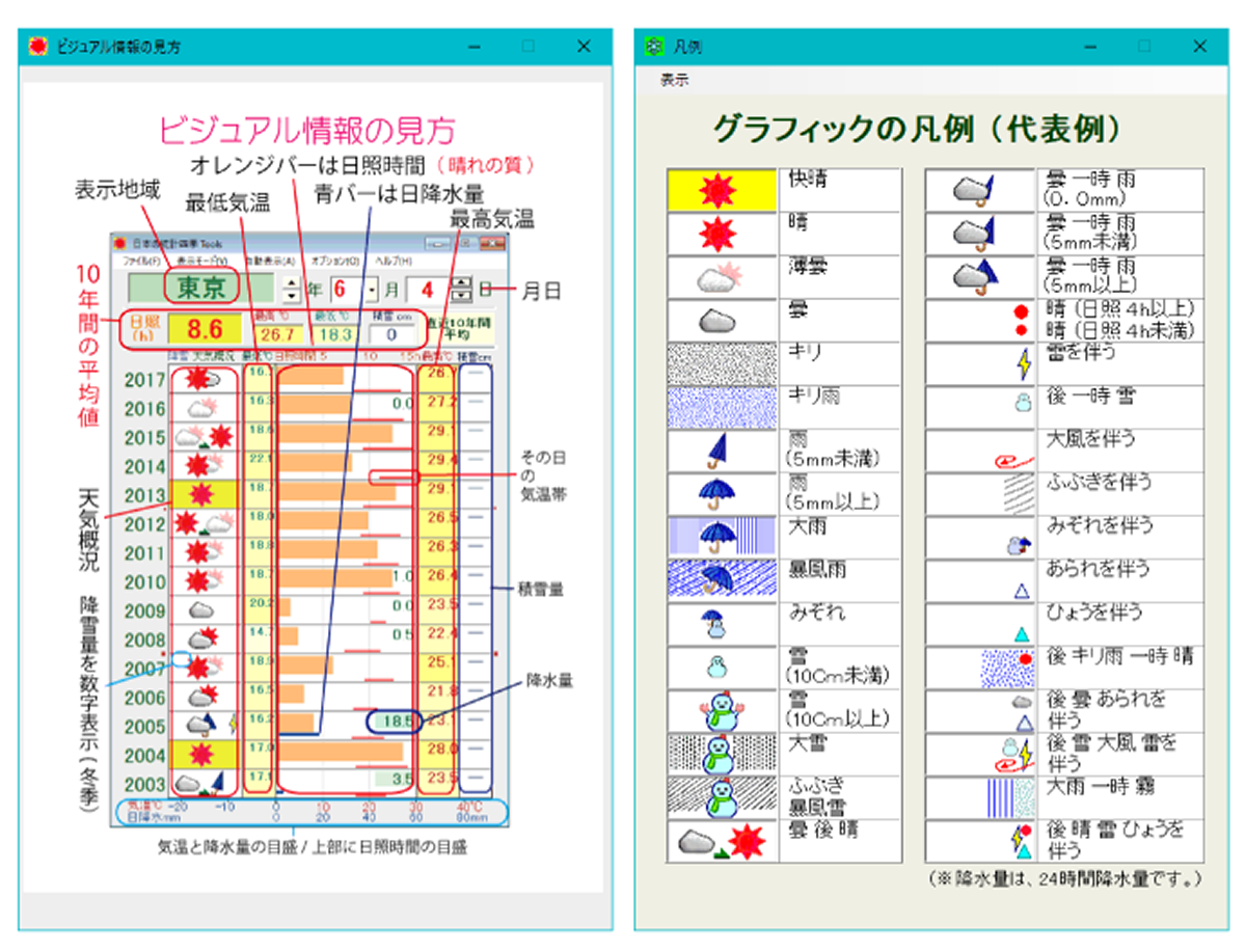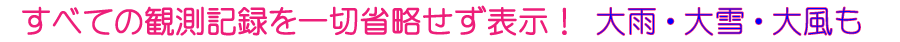 重要ノウハウの3点目です。気象庁の「天気の出現率」は、1年365日の天気概況を「晴・曇・雨・雪」のいずれに当たるかを判定して出現割合の統計を示しています。この場合、近年頻発する、"暴風雨"や"大風"、"大雨"、"大雪"等の記録は四捨五入的に処理されます。このツールでは、「晴」・「雨」・「曇」・「雪」の主要4要素以外の快晴・薄曇・雷・ひょう・あられ・みぞれ・暴風雨・大雨・大風・大雪・霧・霧雨・吹雪、これらすべての観測記録を一切省略せず表示することにしました。こうすることで、私たちの生活に重大な影響がある気象災害を、正確に記録として提供する「記録簿」・「気象地域史」としての役割も提供することが出来ると考えたからです。これも重要な表示ノウハウとなっています。