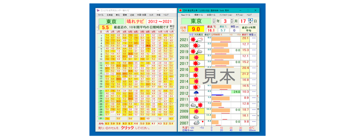 シンプルで使いやすく、日本全国ご当地の好天日、好天時季を過去天気で示す定番ツール。