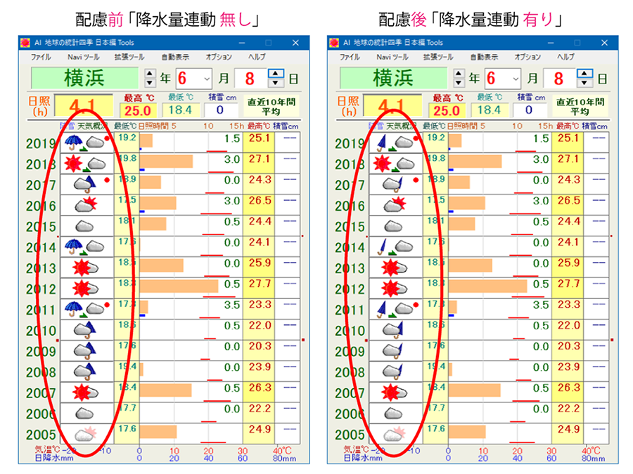 下記の事例「横浜、6月8日」で見ます。傘の開き方が「降水量連動無し」(左)と、「降水量連動あり」(右)の2枚の比較で見ます。