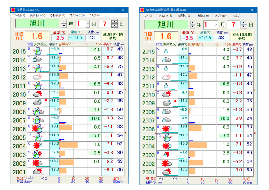 左側の1月7日の表示では、「雪がかなり降っている日」という印象を受けます。しかし、地元の人の生活感覚では「こんなにひどくないよ」という声が聞こえて来そうです。東京などでは5cmや6cmも積もれば大雪で、生活も大混乱するとニュース等で聞いていますが、雪国に生きる人にとって雪が降るのは当たり前のことであって、5cmや6cm程度は「わずかばかりの雪」という感覚です。さすがに10cm以上も積もれば日常レベルを超えるので、「大きな雪だるま」という感覚になりますが、そういう生活感覚です。右側の表示ならば地元の生活感覚と一致します。