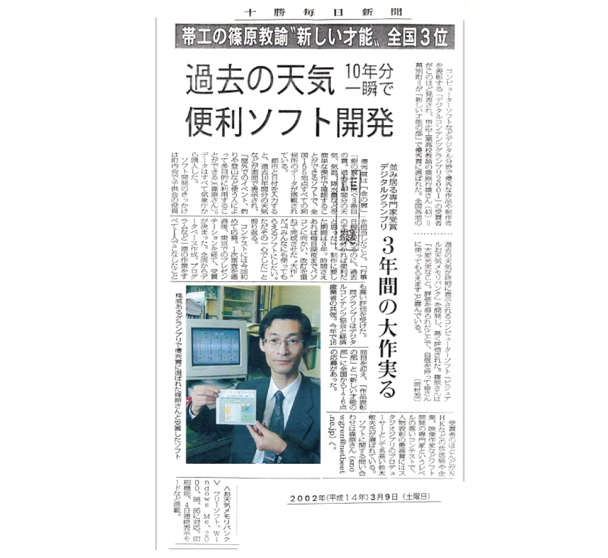 この一区切りの節目を機に、「何やらコンテストがあるので応募してみよう」と、とりあえず応募してみました。そのコンテストは、デジタルコンテンツ協会主催、経済産業省共催の「デジタルコンテンツグランプリ2001」というコンテストで、その「新しい才能の部」に出品しました。審査のため 東京銀座電通第3ビルに出向き 各界の専門家の先生方が居並ぶ中でプレゼンテーションを行ってきました。その1ヶ月後、結果なんと、応募総数136組、「新しい才能の部」の出品総数40組の中において、「ビジュアルお天気メモリ」(現ツールの母体)が、思いもかけず「金の翼賞」、「銀の翼賞」に次ぐ「優秀賞」(5組)をいただくことになりました。贈賞式が、東京青山テピア(鉄鋼会館)において行われ、他の部も合わせ、NTTコミュニケーションズ技術チーム・ソニー銀行技術チーム・NHKのCG制作チーム・スタジオジブリのプロデューサー鈴木敏夫氏の他、蒼々たる出展企業の受賞者がNHKのアナウンサーの司会進行で受賞する、その同じ壇上にての受賞となり、正にビックリの受賞で「晴天の霹靂」でした。子供会の行事で「自分の町の晴れがちな日が知りたい」という単純な動機のソフトウェアが、まさかこのような大きな賞をいただくとは夢にも思っていなかったので、本当にビックリでした。