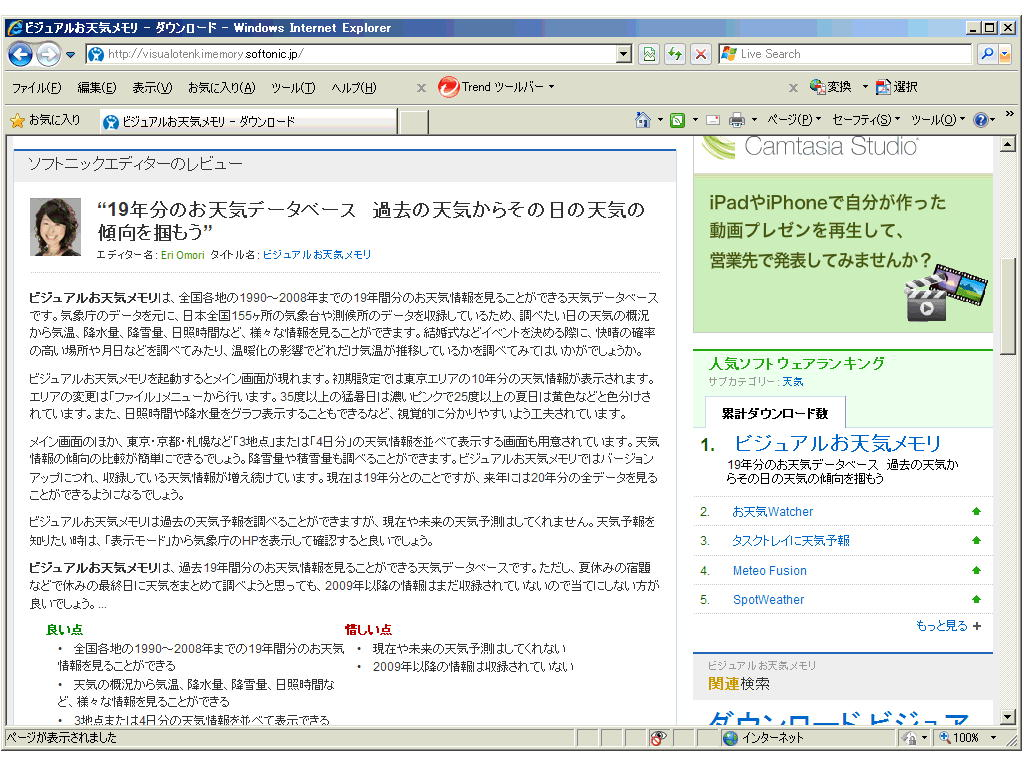 このように様々なご紹介をいただいていたため、Vector社でのダウンロード数が1日数千本以上というような日が多数あり、公開3ヶ月後にはVector社の「定番ソフト」の仲間入りをさせていただき、その定番ランキングでも、定番人気順第1位の座を何度もいただきました。気象庁の部内広報でもご紹介をいただきましたし、全国のユーザーの方からも感謝や激励のメールを多数いただきました。「気象の過去データに命を与えた」とも評されました。各種の雑誌にも多数掲載されました。また、2009年には マイクロソフト社よりBizSpark特別開発会員の特典の恩恵に預かりました。2011年には、ソフトウェアのミシュランガイドとも言われるヨーロッパのソフトニック社より、星9個の高い格付けをいただき、そのソフトニック社が日本法人サイトを開設する際には、最終30万本のソフトを掲載する予定の中での最初の千本の1つに選定されました。
