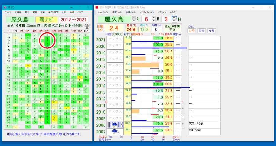 世界遺産にも登録されている屋久島です。小説家の林芙美子氏が「1ヶ月に35日雨が降る島」と書いたくらい雨の頻度が多く、降る量も多量に降る屋久島で、世界遺産の"屋久杉"もこうした水に恵まれた環境で育っていますが、近年「大雨のために宮之浦岳から下山できなくなった」というニュースが流れました。地元に長く住んでいる方は、登山に適した晴れがちな時期を経験的に知っていると思いますが、住んだことの無い方でもその地元の方々と同じく、屋久島の好天日や時期がいつなのかを、「晴れナビ」ツールや「雨ナビ」ツールで一瞬に知ることが出来ます。屋久島はアメダス機械観測に切り替わりましたが、天気概況が無くとも、日照時間と降水量で天気の傾向を把握することが出来ます。7月28日と29日は、直近10年間に一度も5mm以上の雨が無かった日だということがわかります。