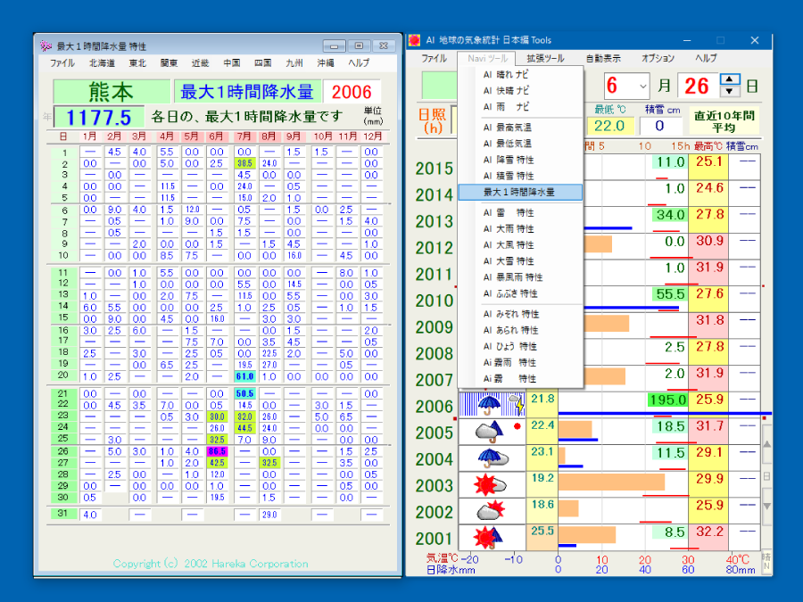 各年毎年の単年のデータに切替えて表示することも出来ます。「地域気象史」としての記録簿の性格も合わせ持ちます。これら19種類のナビをご当地の「図書館」等でも利用いただき、ご当地の気候風土・気象の地域特性で「地域防災」や「気象地域史」、「ふるさと学習」、「語り部活動」等に役立てていただいただきたいと思います。