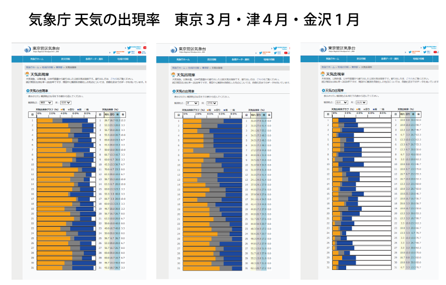 気象庁は「天気の出現率」情報を提供しています。そこでは、晴・曇・雨・雪の出現割合が%で示され、その出現状況をシンプルに知る場合にとても便利です。https://www.data.jma.go.jp/tokyo/shosai/bocho/tenki/link.html