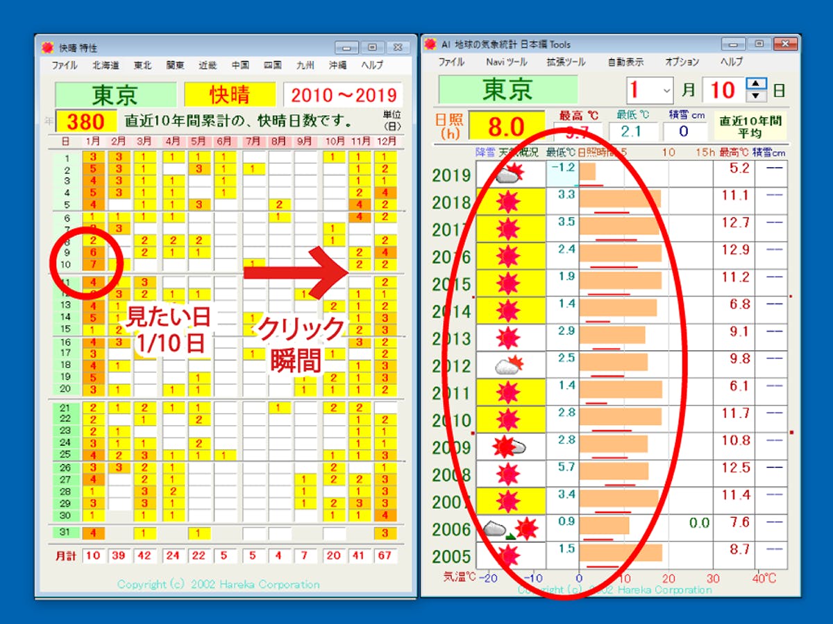 見たい日を選んでクリックするだけ。その日がどんな日かがわかる夢のツールです。「晴れナビ」の発想は、気象庁の「天候ダイヤグラム」をカラー化する発想から産まれています。気象庁には、改めて感謝いたします。「晴れナビ」は、このツールがユーザーにより育てられてきたという経緯の最たる例となっています。