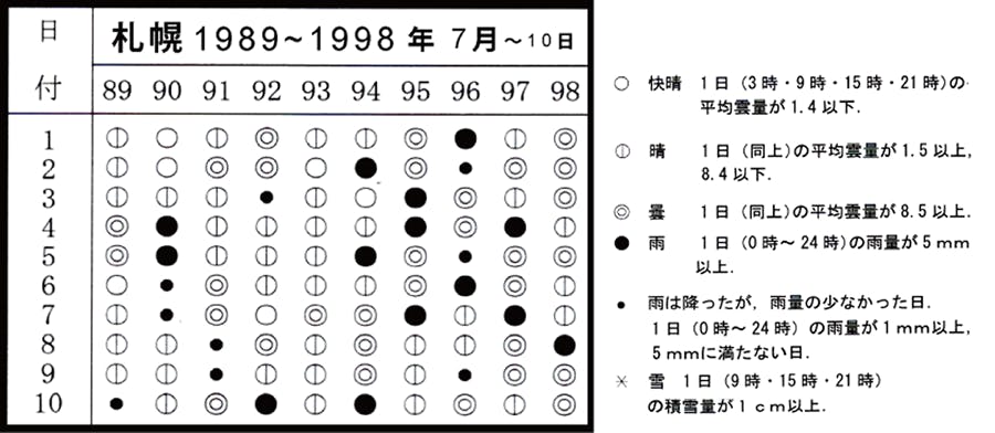 しかし、そんな長期先の旅先の天気でもわかる手段が有りました。 それは、気象庁の「天候ダイヤグラム」です。小学生の頃の夏休みの宿題にあった「お天気調べ」と言えば思い出す方も多いのではないでしょうか。次のような表です。