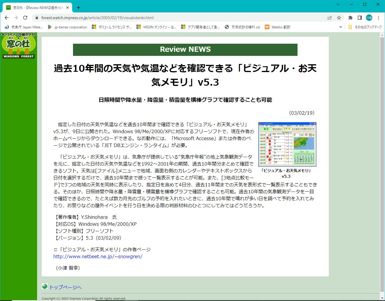 その後もVector社でのダウンロードは続き、ソフトウェア世界のミリオンセラーとも言える絶大な人気と評価を全国の皆様からいただくこととなりました。この時代にいただいた感謝や激励のメールから、実に様々な方々が自分と同じように「過去天気統計」の知見を 必要としていることを知りました。