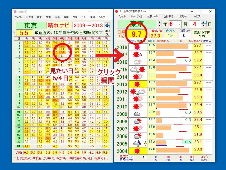 そして、数年の歳月が経っていました。2016年のある朝のこと、実現の方法が突然に脳裏に閃きました。日照時間は、物理的・科学的・客観的・数量的な晴れ度の尺度として使えます。日照時間の10年間の平均を見ると、好天日・時期がわかります。その365日分を一覧表にすれば、ひと目で1年の中の晴れ度の高い日や時期がわかります。この"晴れ度"は観測事実ということで裏付けがある点も重要でした。脳裏に描かれた設計図通りに、見たい日のセルの1クリックで瞬時にデータが表示されるように作り込み、「晴れナビ」と名付けました。こうして「晴れナビ」は誕生しました。忙しい現代の私たちにピッタリと絶賛されました。