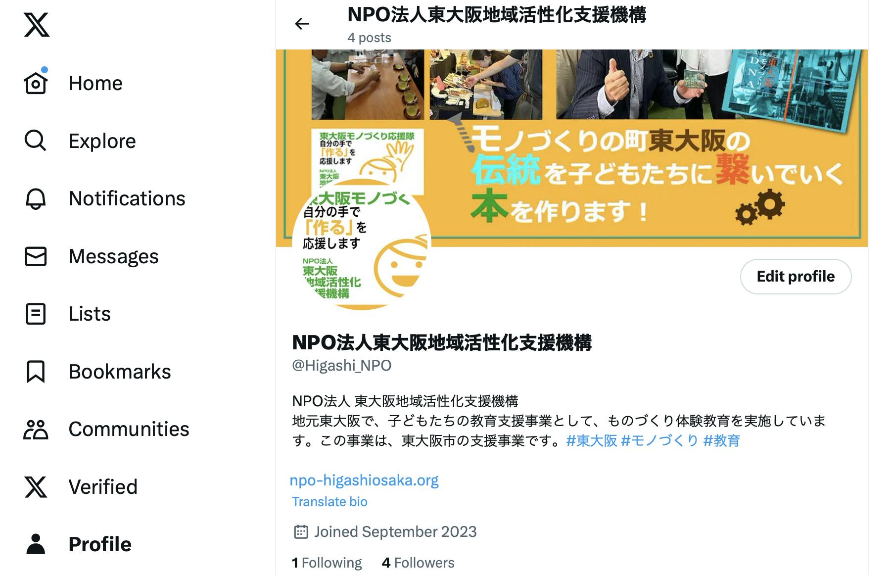 NPO法人東大阪地域活性化支援機構としてのX(旧Twitter)アカウントを作成しました。