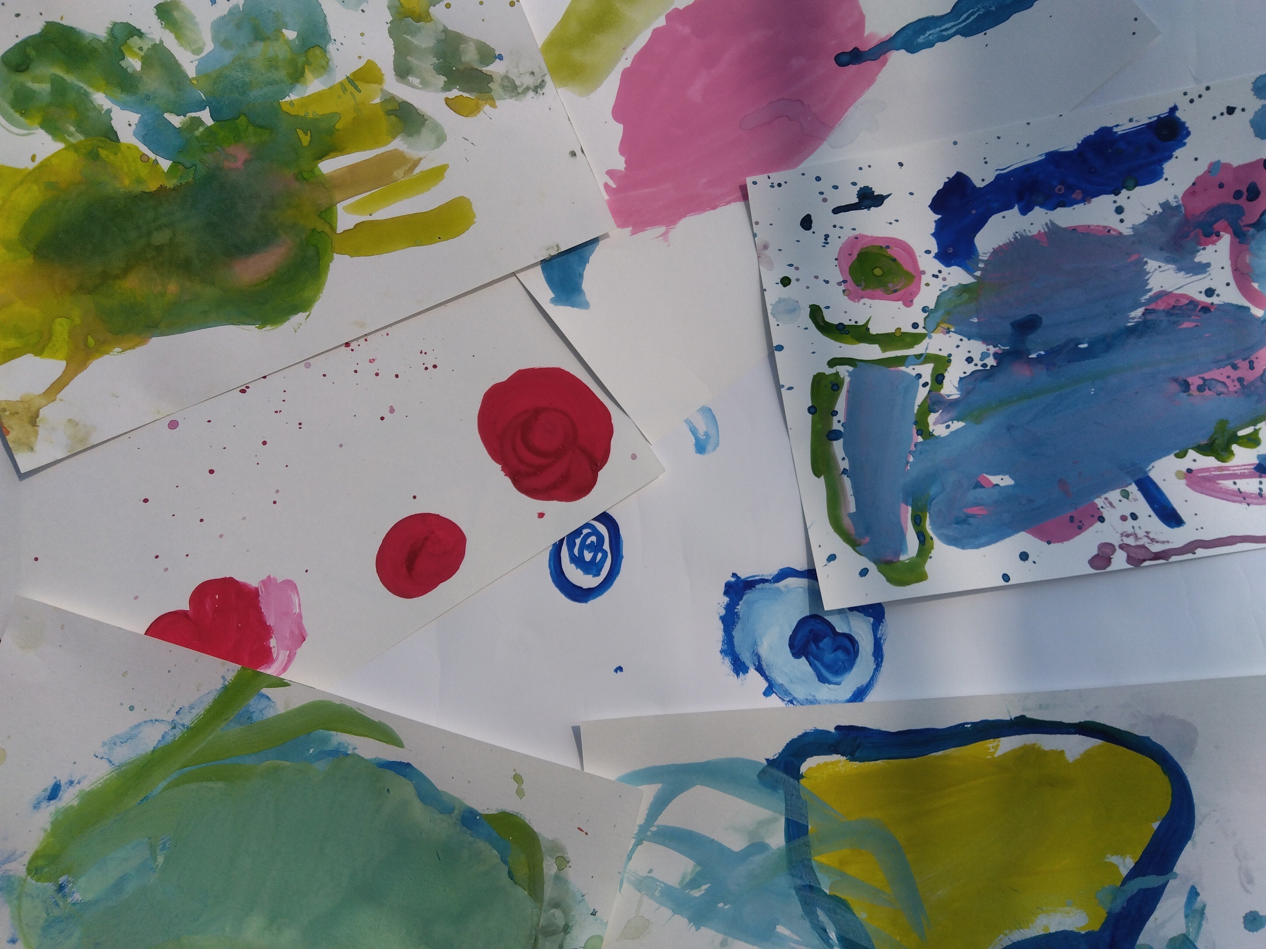 皆さまからの沢山のご支援に心から感謝しています!こども園のつながりアトリエ。そこで絵を描く準備をしていると、「なにしてるのー?」と絵の具の匂いを嗅ぎつけて、こどもたちがひとり、ふたりとやって来ます。「かきたーい!」「かきたーい!」「ぼくはみるだけ。」それぞれです。紙を渡すと小さかったらしく大きい紙をご注文。色もお好きな色を選べます。「ピンクくださーい。」という女の子に「あかとしろをまぜるとピンクになるよ」と上の子が教えてくれました。画用紙の上に、こどもたちは自由に大胆に色をのせていきます。そこから次の色が選ばれ、新しい線や形が現れます。形は全くの自由形。これまでに見たことのないユニークなものばかりです。芸術の秋はもう目の前!ますますこどもたちとのアートの時間が楽しみです。