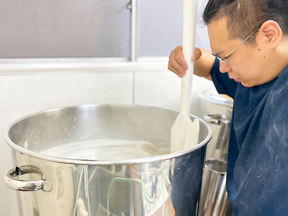 寸胴鍋に麦芽(モルト)とお湯を入れ、温度を保ちながら攪拌(かくはん)します。