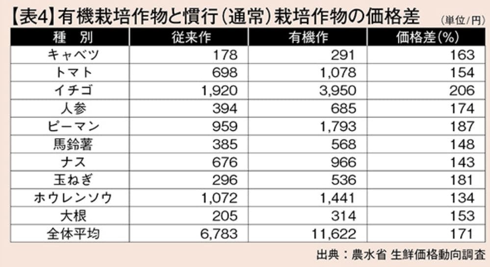 下記資料からもわかる通り、有機農法で作られたオーガニック製品と従来品(通常の製法で作られた食品)には、平均約1.7倍もの価格差があります。
