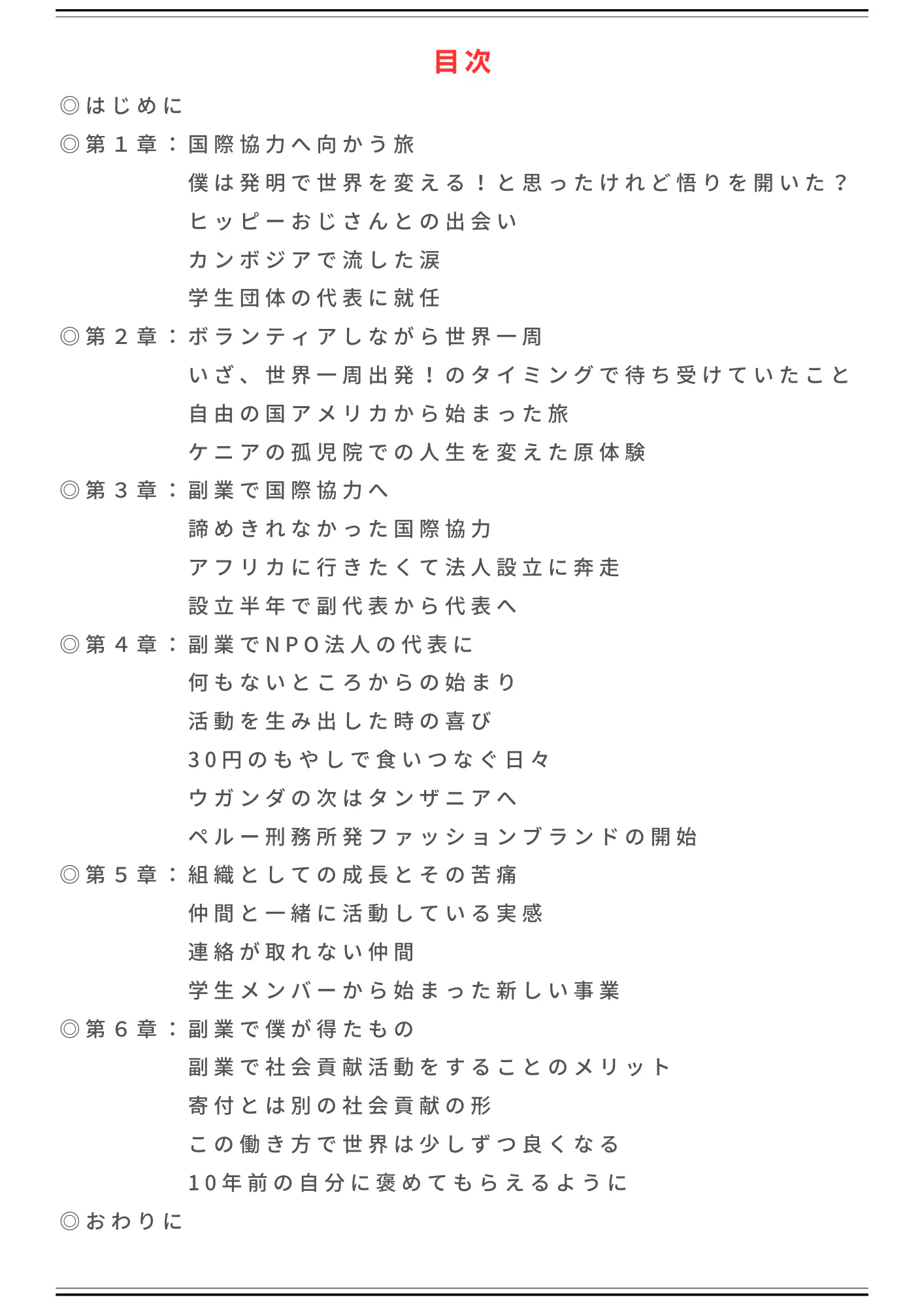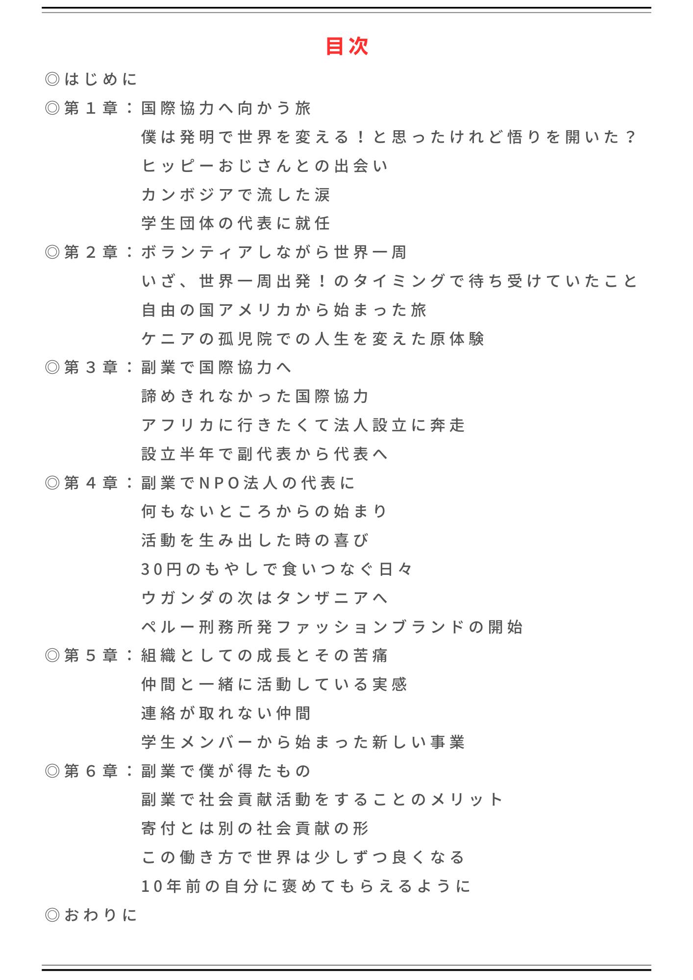 この本では、私が社会貢献活動を始めたきっかけから、ボランティア活動中に味わった挫折、NPO法人の代表理事として失敗したことや団体運営で苦労してきたことなど、約10年間の私の半生を全てお伝えしています!