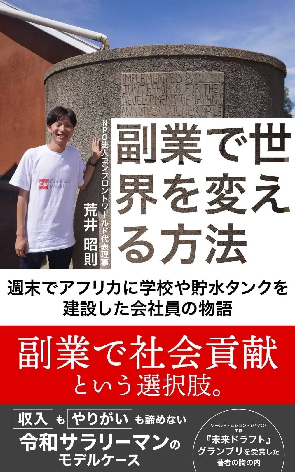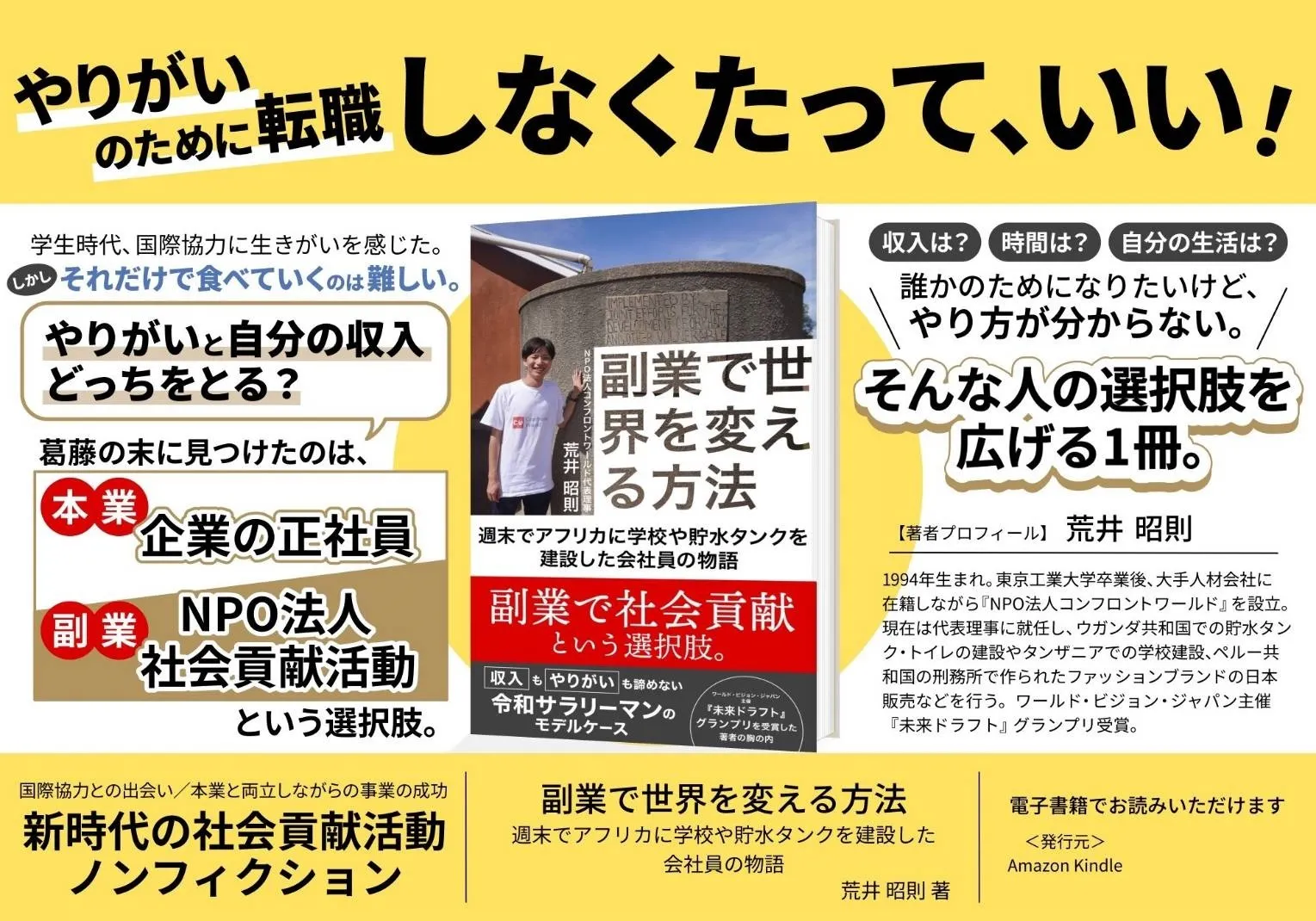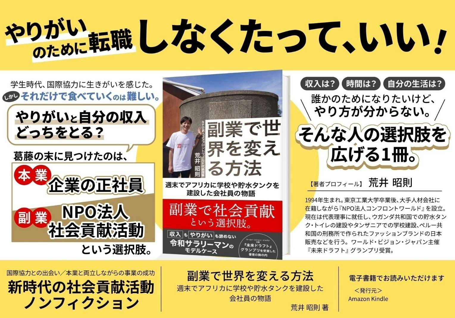 2023/08/25 08:06こんにちは。NPO法人コンフロントワールド代表理事の荒井です。この度ご縁があり本を出版いたしました!簡単に自己紹介させてください。◆学生時代大学入るまで海外に行ったこともなく、パスポートも持っていない人間でした。そんな僕が海外に行ったのは大学一年生の春休み。タイとラオスとカンボジアに一人旅をしました。そこでカンボジアという国に惹かれ、「また行きたい!」という思いと、たまたまその旅行中に会った人に紹介いただき、カンボジアで井戸を作るような、国際協力の学生団体に入りました。そこから海外ボランティアや国際協力にのめりこみ、学生団体を卒業した後には、一年間休学し、「ボランティアしながら世界一周」を行いました。(当時の学生団体では物凄く運営に悩み・苦しみました。。その様子はぜひ読んでみて下さい!)◆世界一周世界一周は様々な国へ行きました。アメリカで自然保護、ネパールで震災復興支援、スリランカの孤児院での映像授業、ケニアの孤児院での支援など。そこで一つ、僕にとっての転換点がありました。それは、ケニアの孤児院でボランティアをしていた時に子どもが亡くなったことです。当時の僕にとっては衝撃的で、交通事故や事件に巻き込まれたわけではなく、ただ普通の生活をしていたのに死んでしまいました。その子どもは日本で生まれたら今でも生きていたと思います。世界はなんて“不条理なんだ”と思いました。◆NPO法人設立そこからNPO法人を設立し、一人でも多くの命を救えればと思い活動しております。とは言っても、生活費を稼がなければいけない、まして奨学金を借りていた僕は起業してリスクを取ることはできず、副業でNPO法人を設立しました。(今も僕の報酬は0です)そこからメンバーが離れていったり、思ったように事業が進まなかったり、本当に多くのことがありました。そこから何とか、ウガンダに水を届けたり、タンザニアに学校を作ったり、ペルー刑務所発ファッションブランドの日本販売を開始したり、メンバー含め、多くの方々の支えで今も活動が成り立っております。その葛藤や、そしてやりがい・楽しさなどを存分に詰め込みました。執筆する時はお酒を飲んで書いた時もあります。ただ、カッコ良い、憧れる姿ではなく、副業で社会貢献を行おうとする20代の普通のサラリーマンの等身大の葛藤や、泥臭さを詰めました。一人でも多くの人に勇気を、そして「副業で社会貢献」という選択肢が広まればと思っております。ぜひご購入下さい!! もっと見る