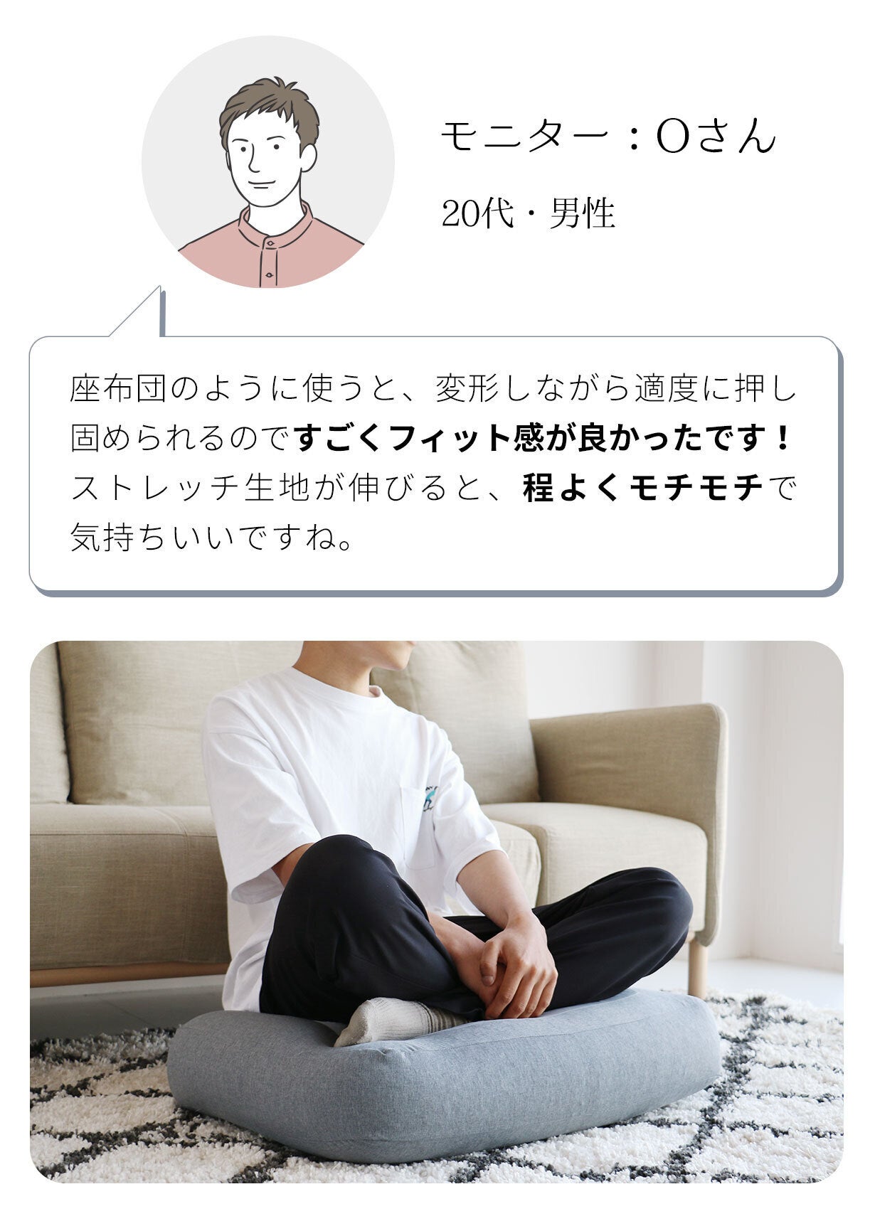 従来のビーズクッションは全ての生地がストレッチ生地になっている事が多く、支える部分がないので床にお尻があたってしまったり、生地が伸びてしまい使い心地が悪くなってしまうことも。
