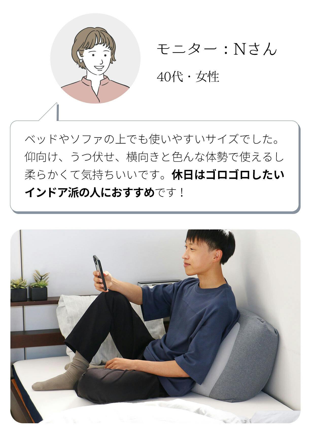 横幅約60cm、縦幅約45cmという絶妙なサイズ感だから、まくらとして使用するときは、しっかりと頭から肩までをカバー。うつ伏せでも腕まで置ける幅広サイズ。