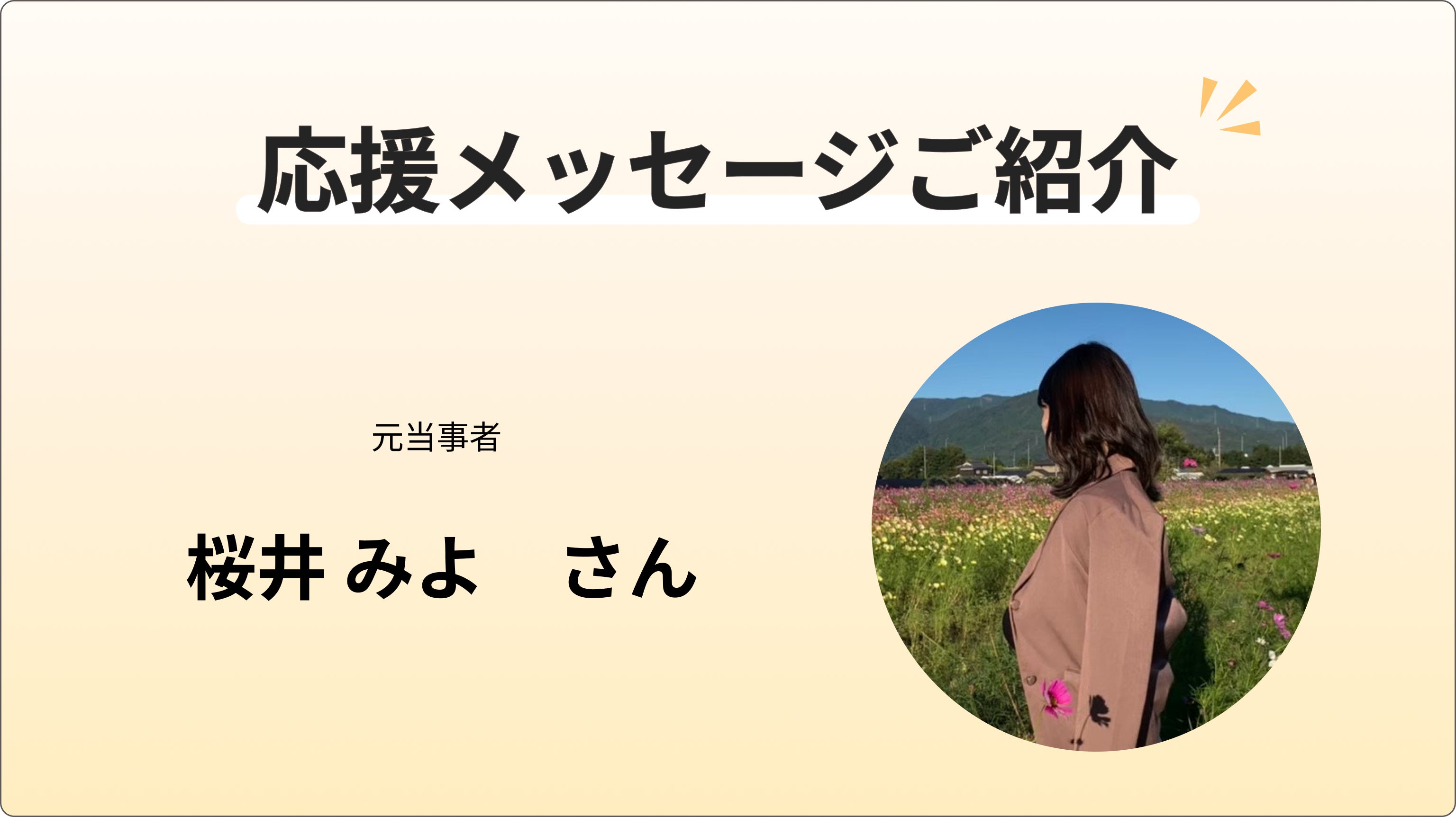 今回は桜井みよさんから応援メッセージをいただきました。桜井さんは元当事者として応援してくださっています!