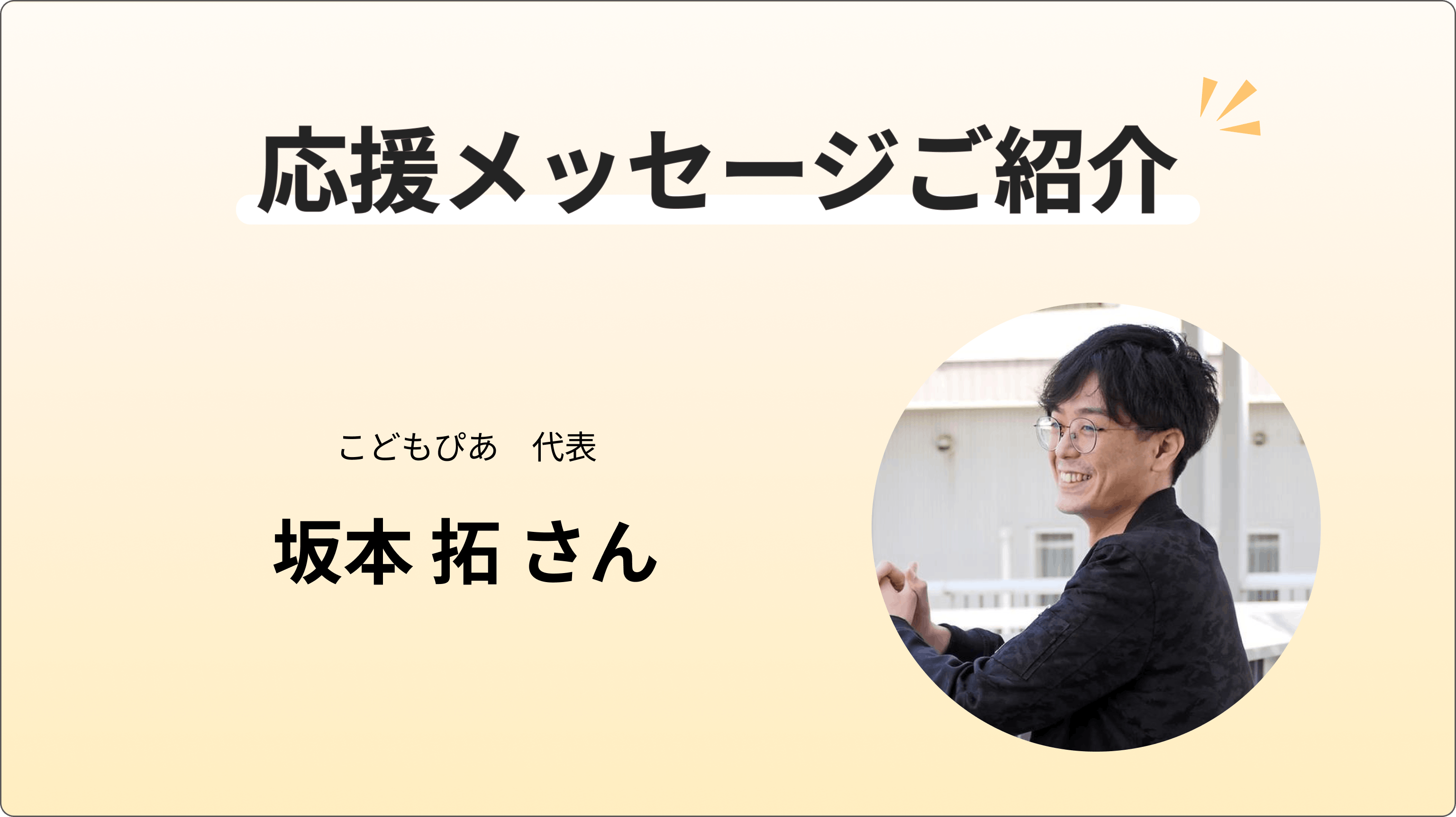 今回はこどもぴあ代表の坂本拓さんから応援メッセージをいただきました。こどもぴあさんは同領域の活動をおこなっている大先輩の団体です。