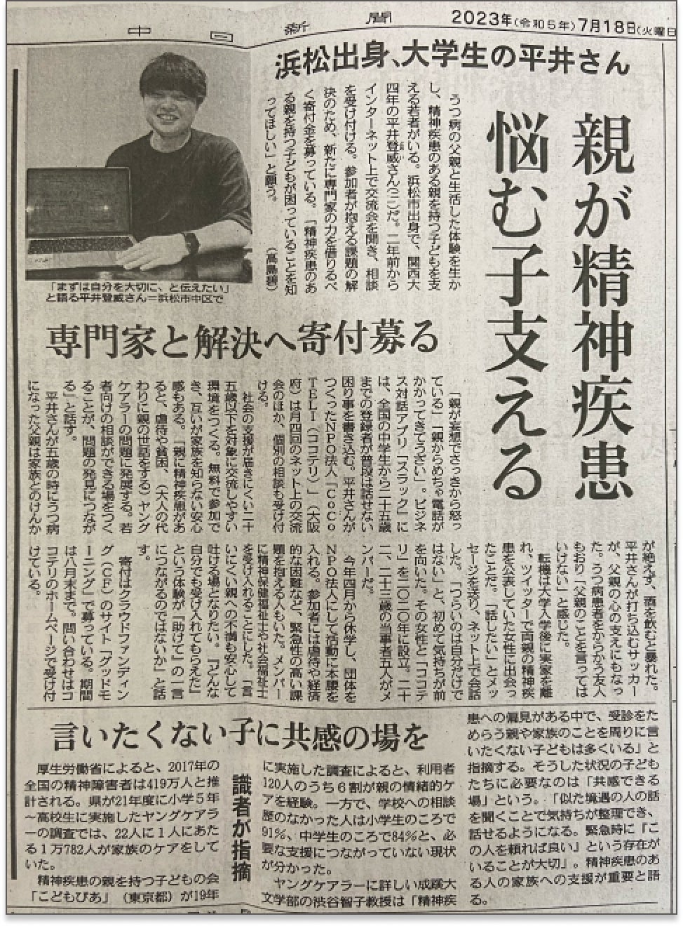 2023年7月18日発行の中日新聞の一面に、CoCoTELIが掲載されました!
