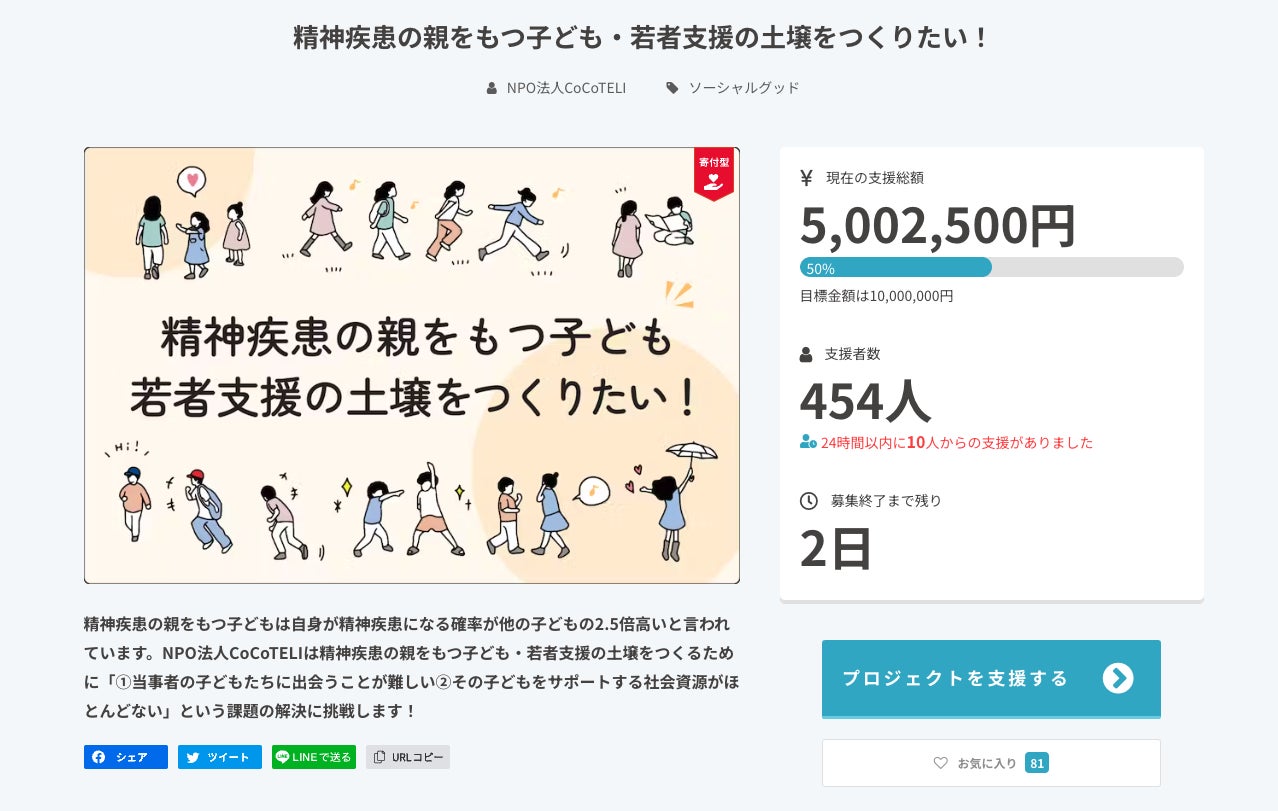 目標金額1,000万円、目標支援者数1500人の達成、その先にある精神疾患の親をもつ子ども・若者支援の土壌づくりに向けてラストスパート頑張ります!