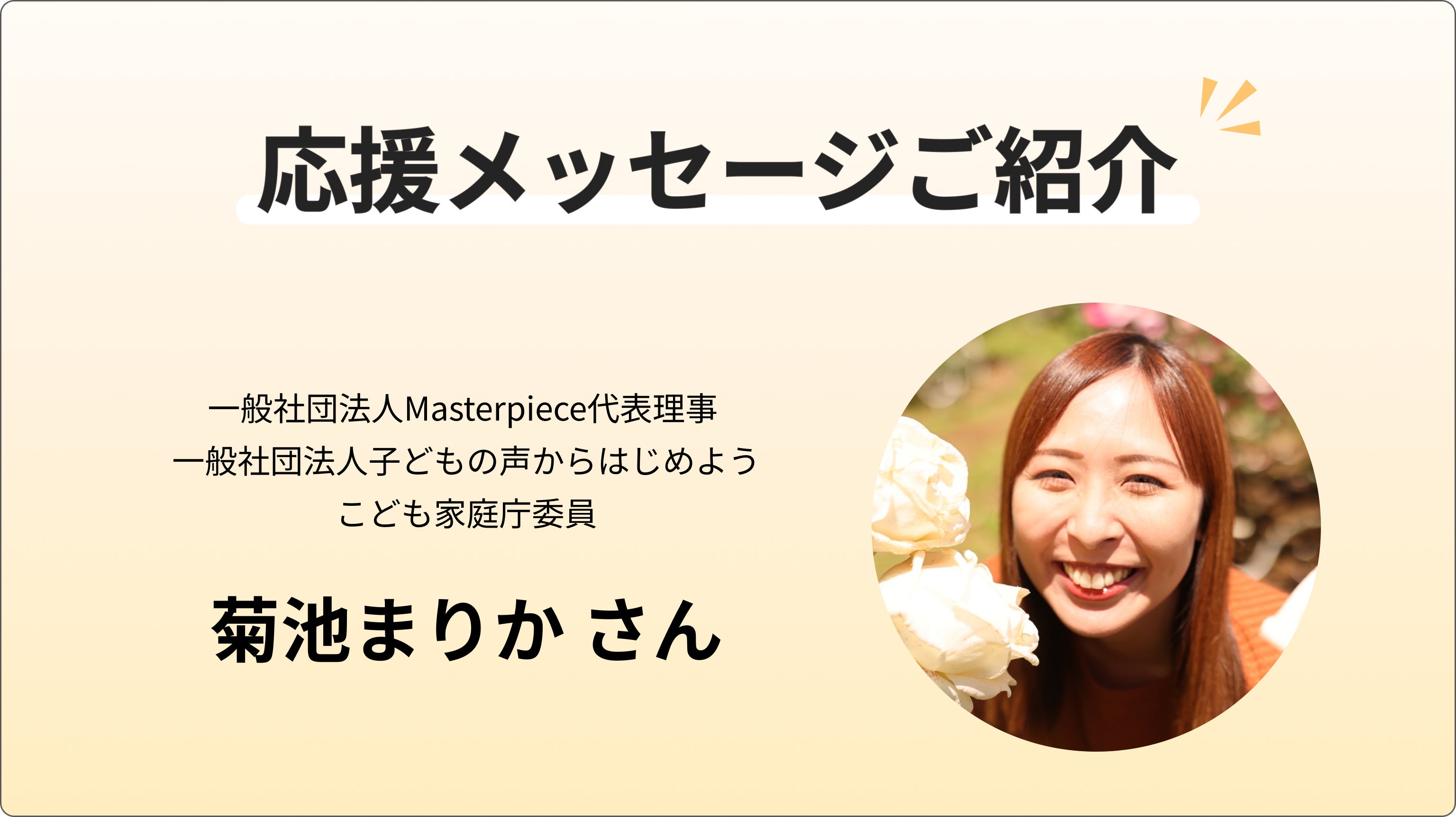 ▼私たちのプロジェクト概要精神疾患の親をもつ子どもは自身が精神疾患になる確率が他の子どもの2.5倍高いと言われています。NPO法人CoCoTELIは精神疾患の親をもつ子ども・若者支援の土壌をつくるために「①当事者の子どもたちに出会うことが難しい②その子どもをサポートする社会資源がほとんどない」という課題の解決に挑戦しています!詳細はこちら今回は一般社団法人Masterpiece代表理事の菊池まりかさんから応援メッセージをいただきました。まりっぺこと、まりかさんは一般社団法人Masterpiece代表理事をされながら、一般社団法人子どもの声からはじめようやこども家庭庁委員としてもご活躍されています。菊池まりかさん(一般社団法人Masterpiece代表理事)からの応援メッセージ様々な理由で親を頼りづらい若者のサポート事業をしています。児童養護施設などの入所理由の中には「親の精神疾患により養育が難しい」という事も多いです。子どもたちが大人の見守りの中で育っていくべき年齢の時に、十分に子どもらしくいられなかったということが多くの家庭で起きていると思います。「自分が我慢すれば大丈夫」「自分が支えなきゃ」と思いを押し込めてきた子どもたちがたくさんいると思います。CoCoTELIではそんは若者たちの思いを共有できる場としてとても大切な居場所だと思います。多くの自助グループがある中、この分野への取り組みはとても先駆的で、多くの若者たちの心に光が差し込むきっかけとなると思います。専門家のアドバイスを受けながらこの場を運営していくことはとても重要なことであり、運営する側へのサポートもとても重要です。とおい君とは、アドボカシー関連で共にイギリスとスウェーデンの視察に行きました。とおい君は気さくで現地の方とたくさん仲良くなったり、チャレンジ精神が旺盛です!そして、彼の語る言葉はいつも人に勇気を与えてくれます。CoCoTELIの皆さんの活動を応援していますし、今後の展開が楽しみです!!