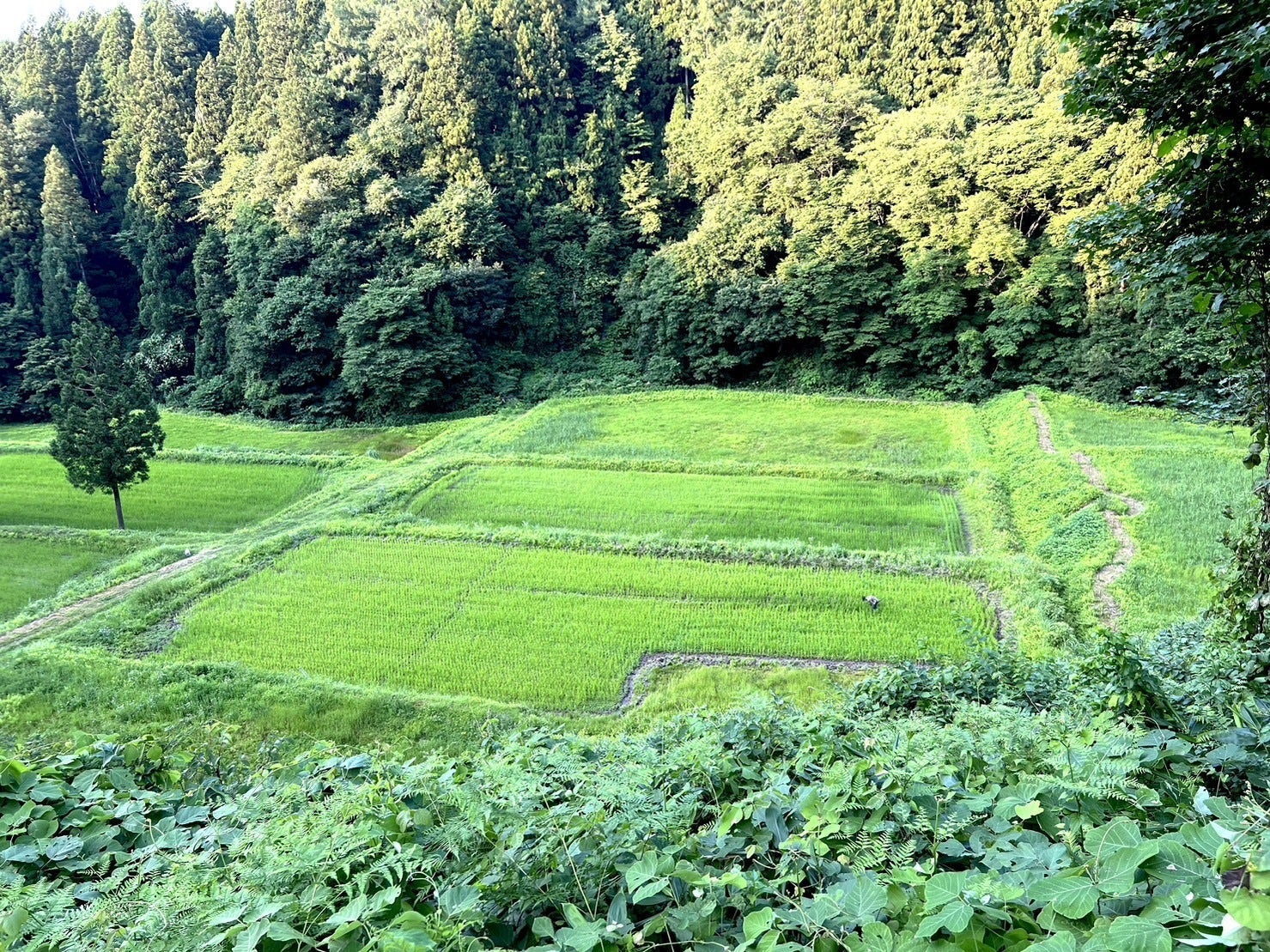 活動報告です。海上さんとユカちゃんが、毎日田んぼや畑の雑草と戦ってくれています。もはや草取りではなく、草抜きです。生まれて初めて草抜きで手のマメがつぶれました。雑草は慣れていますが、今年の雑草は、地球温暖化の無形文化遺産に登録して欲しいと思うほど、ある意味生き生きとたくましく、人智の底浅さを思い知らされます。今回の企画で管理機、バインダー、田植え機、トラクター等の農機具が少しづつ揃えば、生産管理で先手を打てるようになるため、美しく美味しく安くて安全なお米や作物を大量に作らせて頂く事が現実のものとなります。炎天下の中、このように日影日陰ができた箇所で作業するように工夫してます。手前の田んぼの右にポツンと見えるのがユカちゃん。これから中干し=田んぼの水抜きをして、一旦田んぼに大きな日割れが入るまでカチカチに乾燥させます。稲は枯れてはいけないと水を求めて根が土に深く入りますし、雑草の根が切れるため雑草被害が軽減されます。約10日カラカラにします。お盆前にまた水を張りますが、根が土に深く入っているため、台風でも稲が倒れにくくなります。また、土屋が固くなるので、稲刈りの時に泥がぐちゃぐちゃしなくなります。棚田は、田んぼの中から水が沸くこともあるので、乾かすのも一苦労。この写真のなかで、田んぼの中に黒い十字が見えると思います。これは炎天下の中、ユカちゃんが田んぼの中に溝を掘ってくれたものです。こうする事で、田んぼ中央の抜けにくい。水が早く排水できます。点のように小さく見えるユカちゃんのあたりは、すでに水面より5センチ以上上まで雑草が繁茂してしまった箇所です。小さくポツンと見えるのは海上さん。 通常ならば、田んぼ周囲の草刈りを済ませなければならない時期ですが、今年は田んぼの中の草抜き草取りで、畦草刈りは猛暑の8月仕事です。田んぼ農家は、この草刈りができなくなったら店じまいです。草刈り応援隊が切望されています。以上、活動報告でした。引き続き、何卒宜しくお願いいたします。