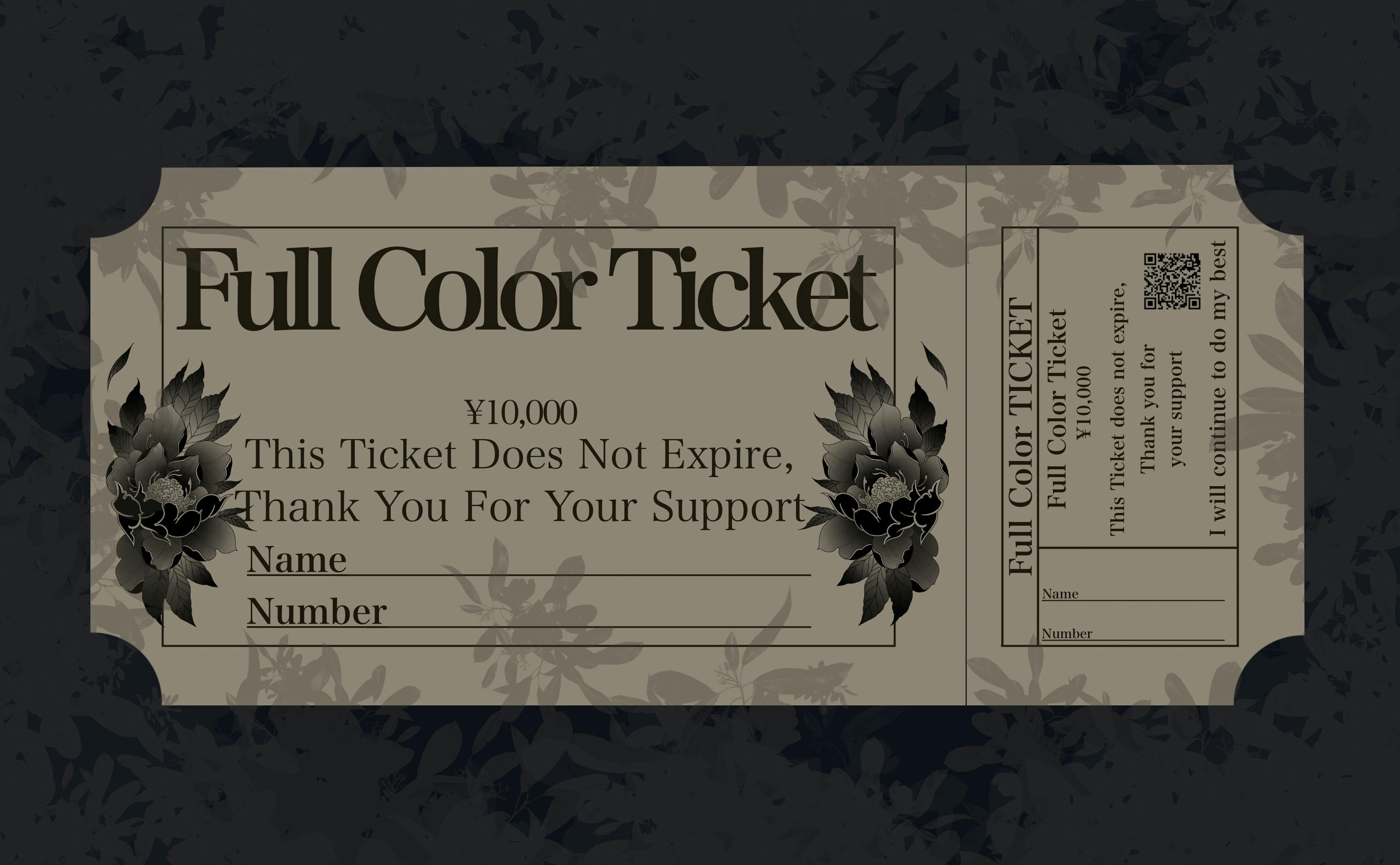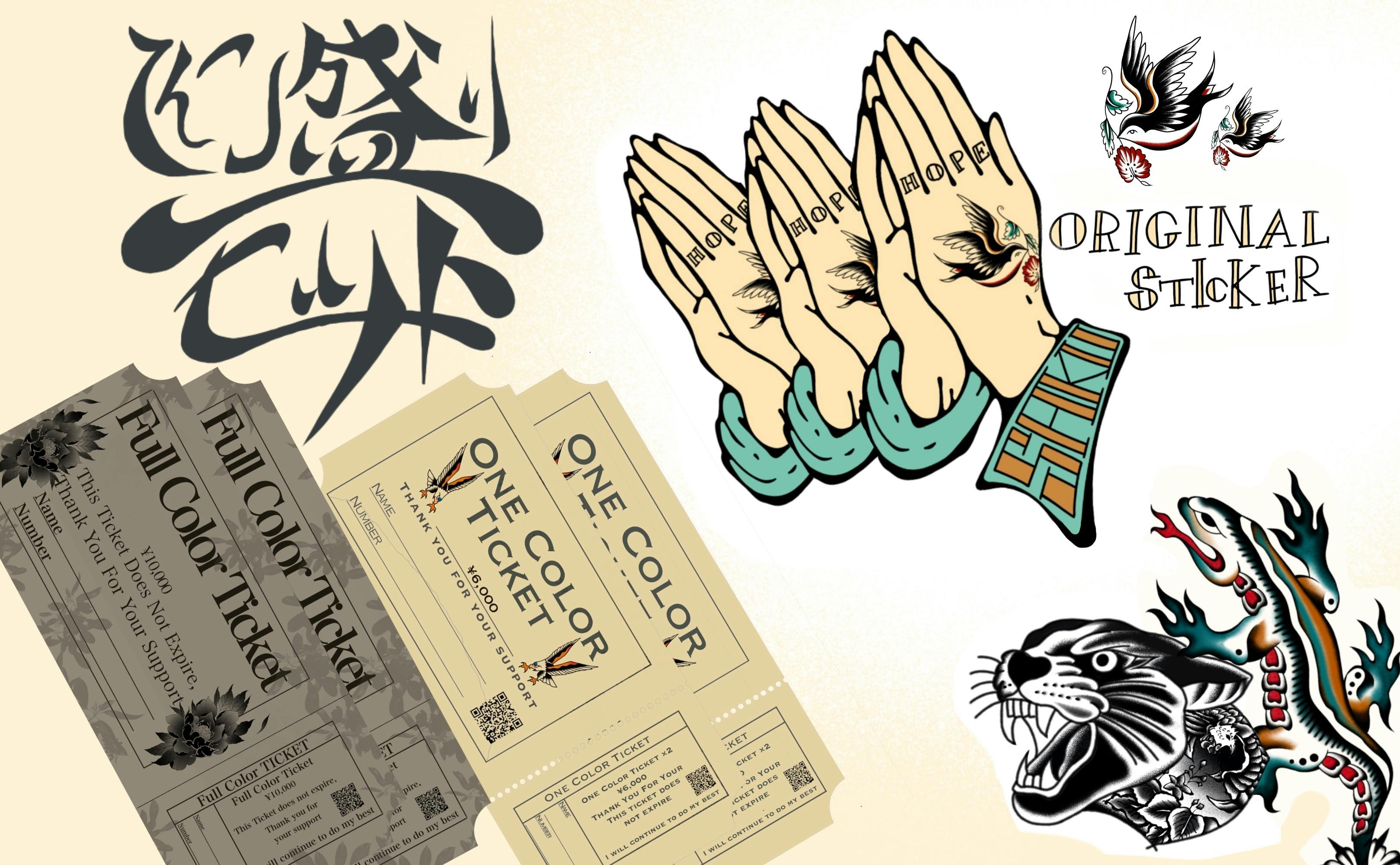 フルカラーデザインチケット2枚とオリジナルステッカー3枚セットになります。それとお礼のメールを送らせていただきます。 フルカラーデザインチケットは色の縛りなしのデザインのものを描かせていただきます。あなただけに描くオリジナルデザインになります。支援後SNSでのやり取りをさせていただきます。お渡しはJPEGになります。 オリジナルステッカーは55×91㎜程の名刺サイズのものが3枚セットになります。※ステッカー素材は接着面側からセパレーター・糊・印刷フィルム・UVラミネートされた耐水性のあるものになります。チケットでの施術は僕がタトゥーマシンを使って、デザインをできるようになってからになるためお時間をいただく事になります。希望の方のみ練習期間での施術も可能です。よろしくお願いします。チケットには支援者の方の名前入りの画像でのお渡しになります。※必ず備考欄に希望のお名前をご記入ください。